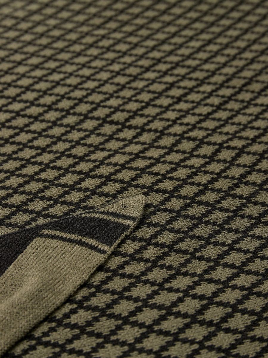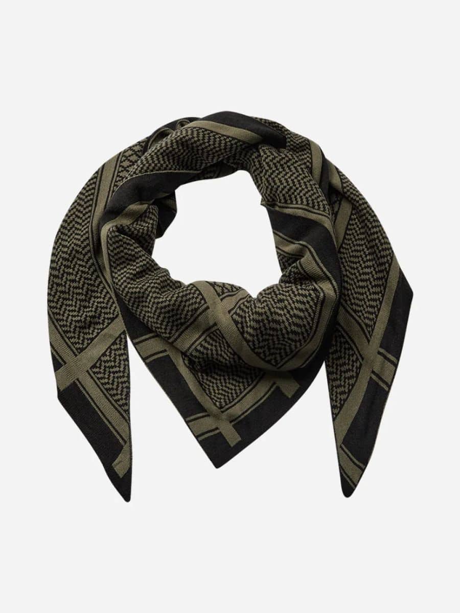 Det stilfulde mønster i sort står i flot kontrast til den olivengrønne baggrund, hvilket giver tørklædet et unikt og moderne udtryk. Det trekantede design giver mulighed for forskellige stylingmuligheder, så du kan drape det på en måde, der passer til din personlige stil.