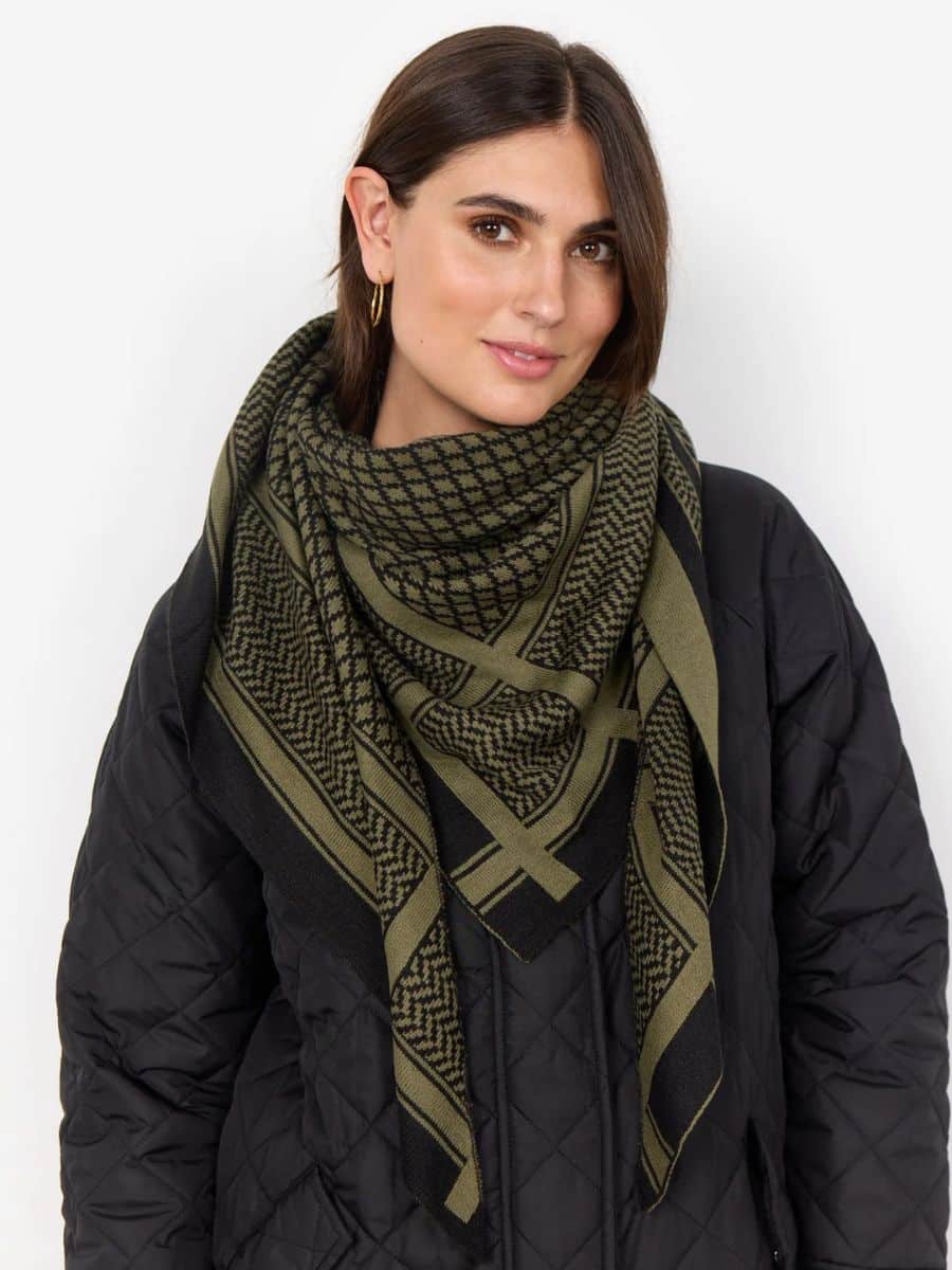 Soya Tørklæde i en smuk olivengrøn farve med et elegant sort mønster er en fantastisk tilføjelse til enhver efterårs- og vintergarderobe. Dette halstørklæde er fremstillet i en lækker akrylkvalitet, der sikrer både varme og komfort, så du kan holde dig varm på de kølige dage.