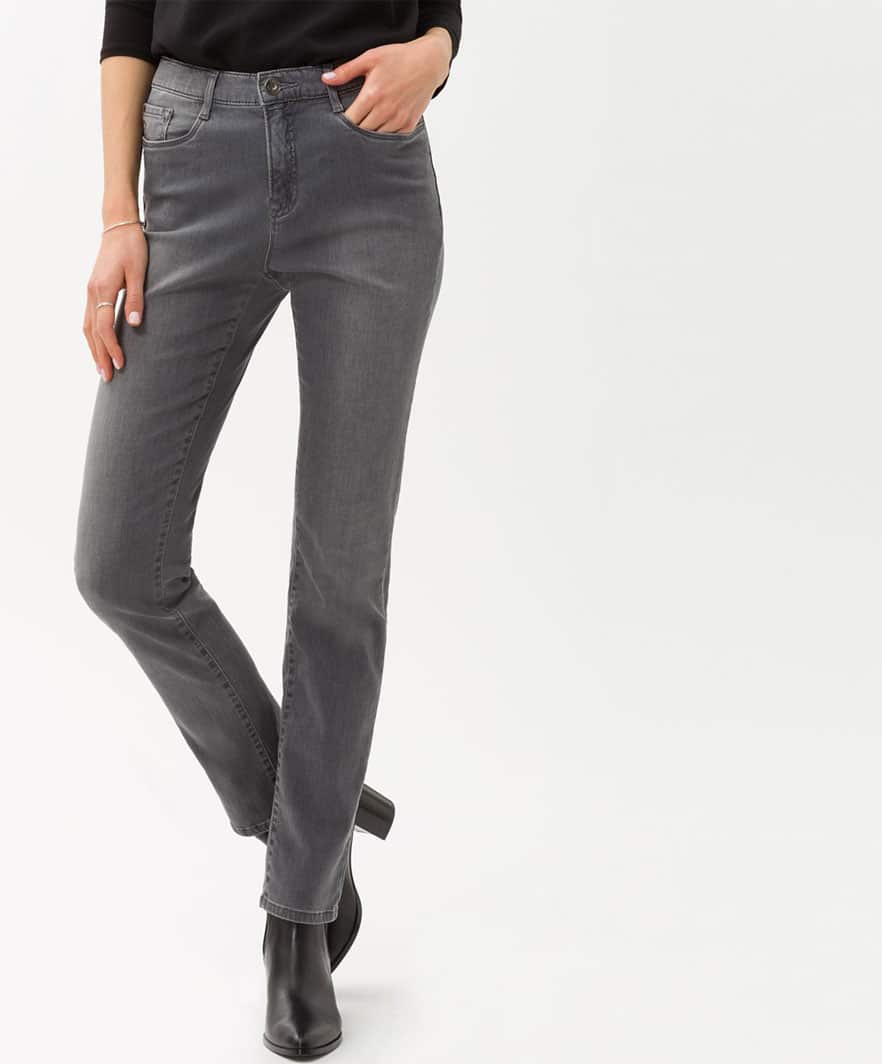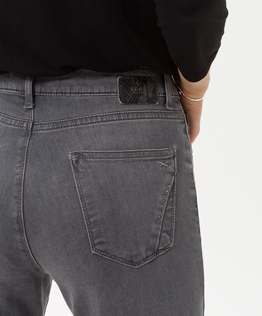 Klassisk jeans fra Brax til damer. Modellen er med fast linning samt med side lommer og med 2 baglommer hvor der sidder swarovski sten. Modellen Mary er til kvinden med almindelig talje højde og med smal /Regular lårvidde. Denne Brax buks er i en flot grå farve og benlængden er 80 cm lang. Style denne jeans til forskellige over dele som skjorter eller strik