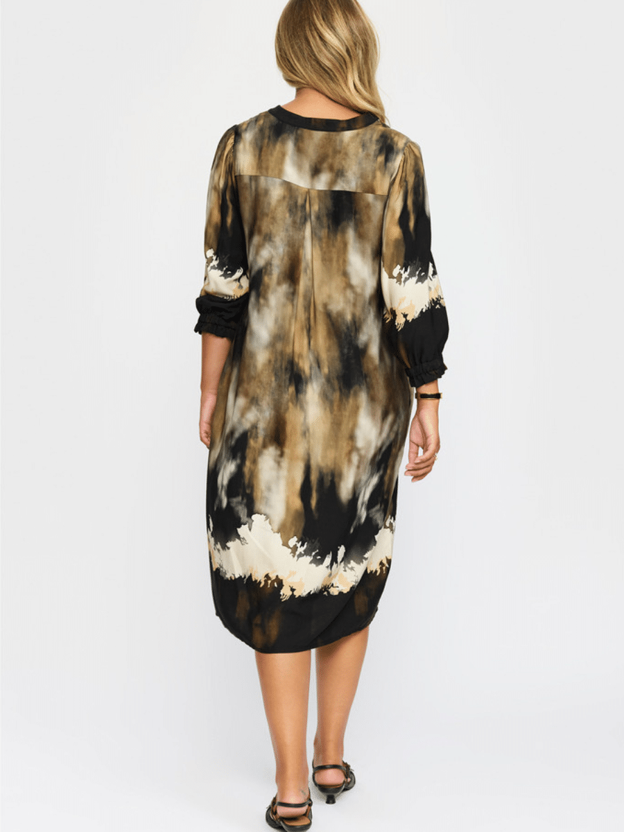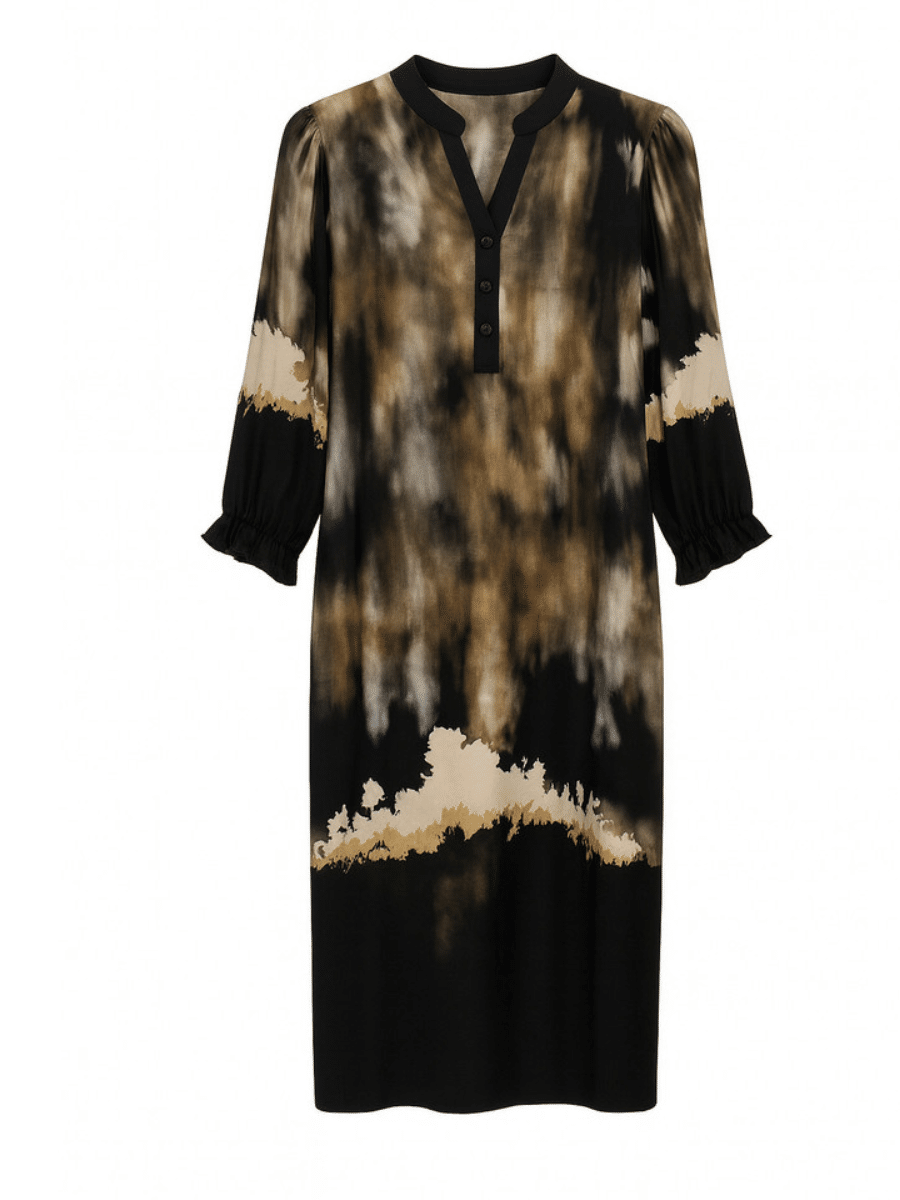 er en elegant og tidløs kjole, der kombinerer komfort med et moderne udtryk. Den stilfulde farve Black Wave giver kjolen et eksklusivt look, som gør den perfekt til både hverdagsbrug, kontoret og festlige lejligheder.