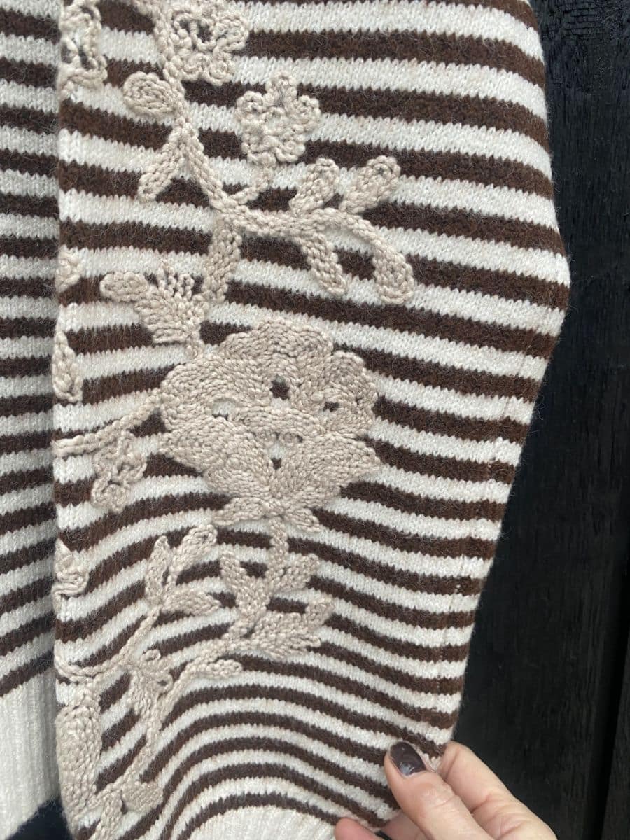 Denne smukke model er med en klassisk rund halsudskæring, og med lange ærmer, som går ind i bunden, hvilket giver ærmerne et smart puff look, strikken har et lækkert broderet mønster på ærmerne. Strikken har en smuk ribt kant i bunden af ærmerne, i bunden af selve strikken, og rundt i halsudskæringen.