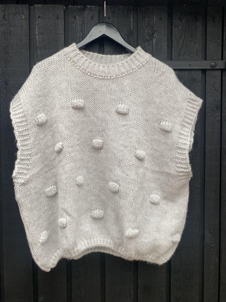 Denne smukke model er med en klassisk rund halsudskæring, og med korte ærmer, som dækker skuldrene. Strikken har et smukt prik mønster på vesten, hvilket er en lækker detalje, derudover har vesten er smuk ribt kant omkring halsudskæringen, i bunden af de korte ærmer, og i bunden af selve strikken.
