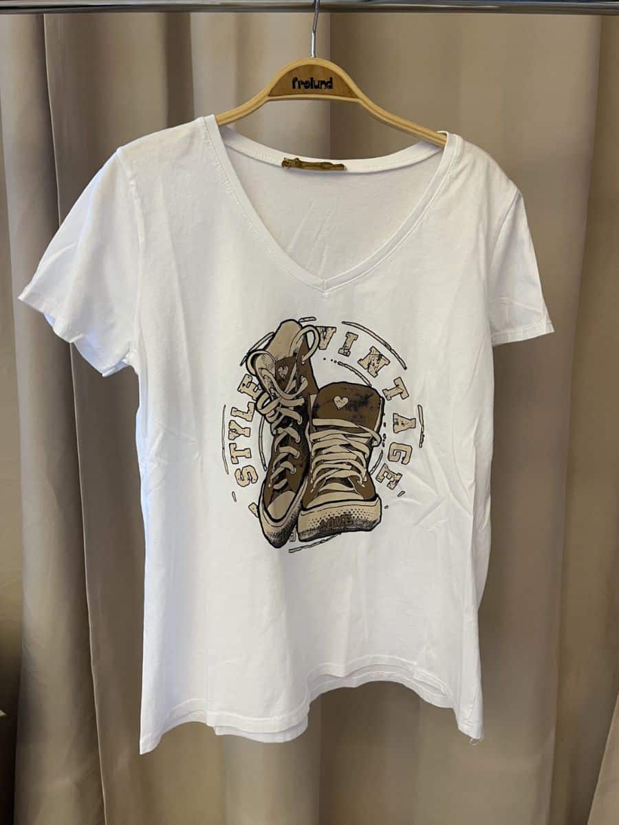 Denne smukke Boho Love T-shirt er i en klassisk hvid farve, med et smuk print med sko i midten, som er en lækker detalje, derudover har denne smukke Boho Love T-shirt en smuk dyb V-udskæring, og korte ærmer, som er to klassiske detaljer.