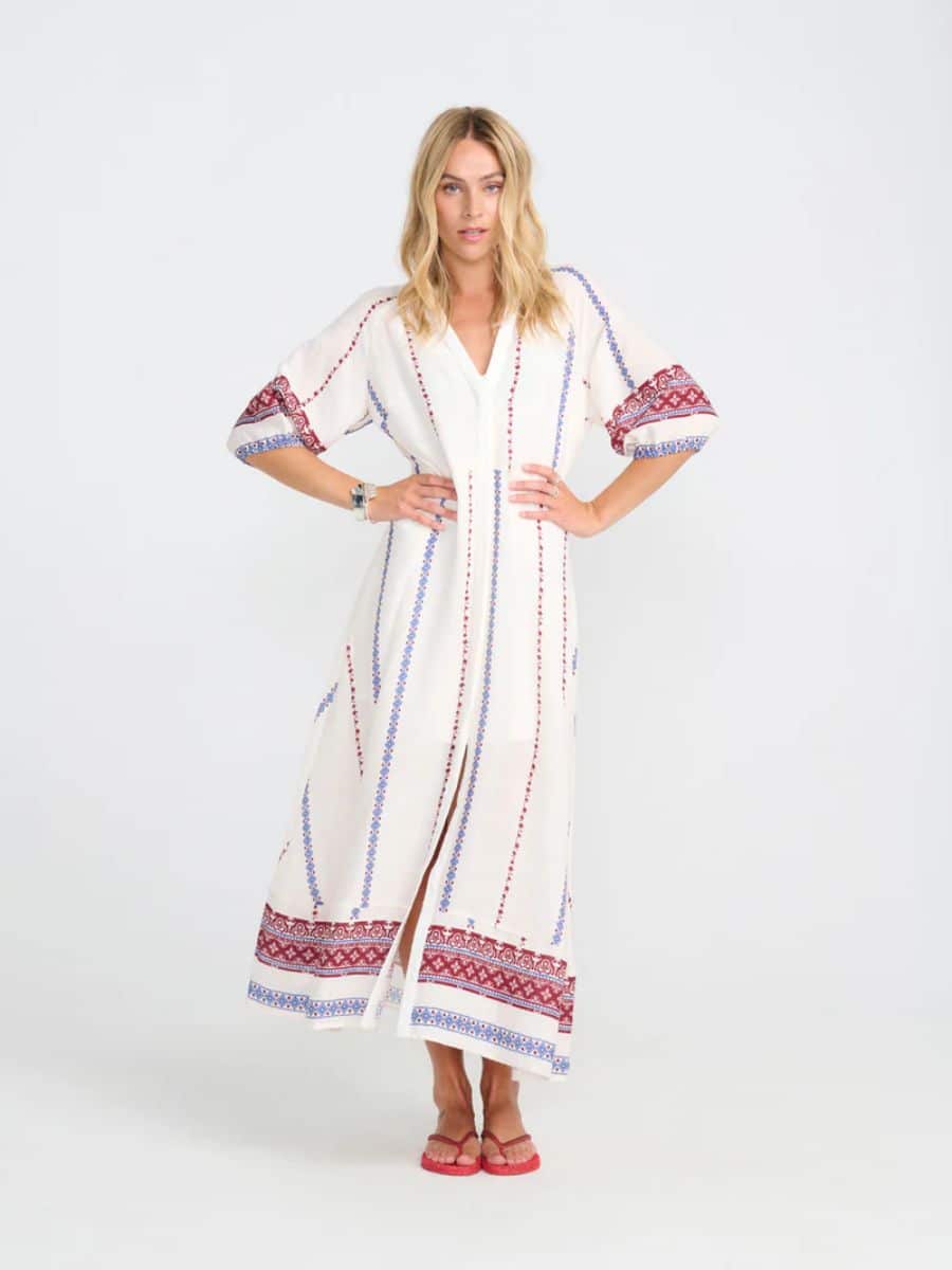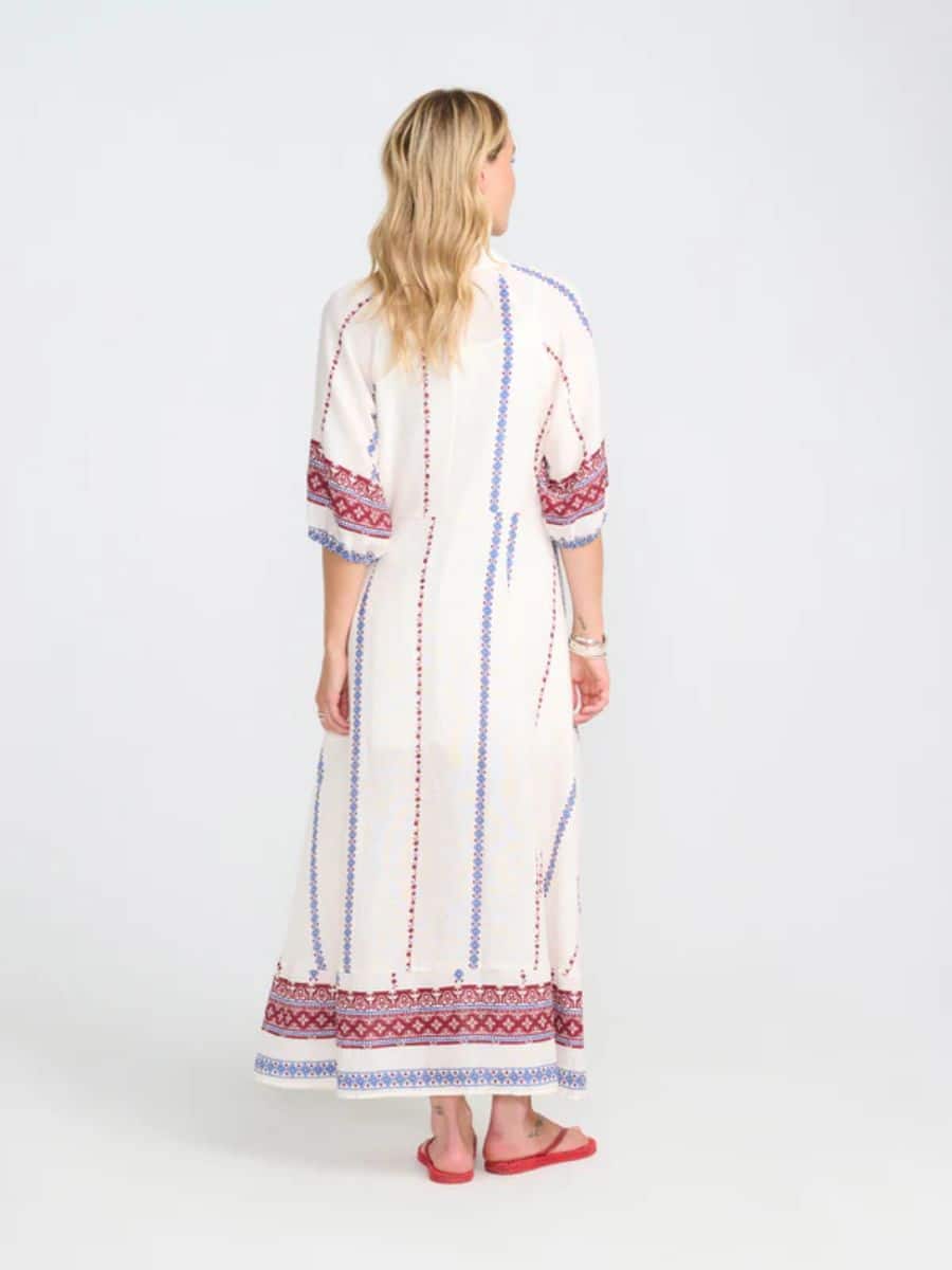 Costa Mani Kjole Hyacinth ♥ Denne smukke kjole fra Costa mani er i en smuk hvid farve, og med lækre blå og røde printet detaljer, hvilket er en smuk detalje. Denne smukke kjole er fyldt med en masse smukke detaljer, hvilket gør den super feminin, derudover er kjolen lavet i lækre materialer, som gør den super komfortabel at have på.