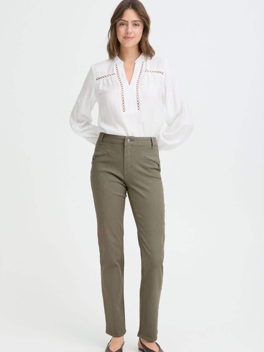 Fransa Bukser Zenia – Smokey Olive ♥ Disse smukke Fransa bukser er i en lækker olivengrøn farve, og er fyldt med en masse smukke detaljer. Bukserne er lavet i lækre materialer, som gør dem super komfortabel at have på.