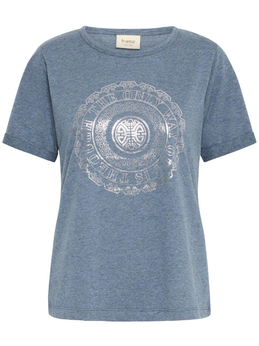 Fransa T-Shirt Frjasmine – Bering ♥ Denne smukke T-shirt fra Fransa er i en lækker blå farve, og har et smuk sølv print med teksten “THE ONLY WAY OUT IS THROUGH” hvilket er en lækker detalje.