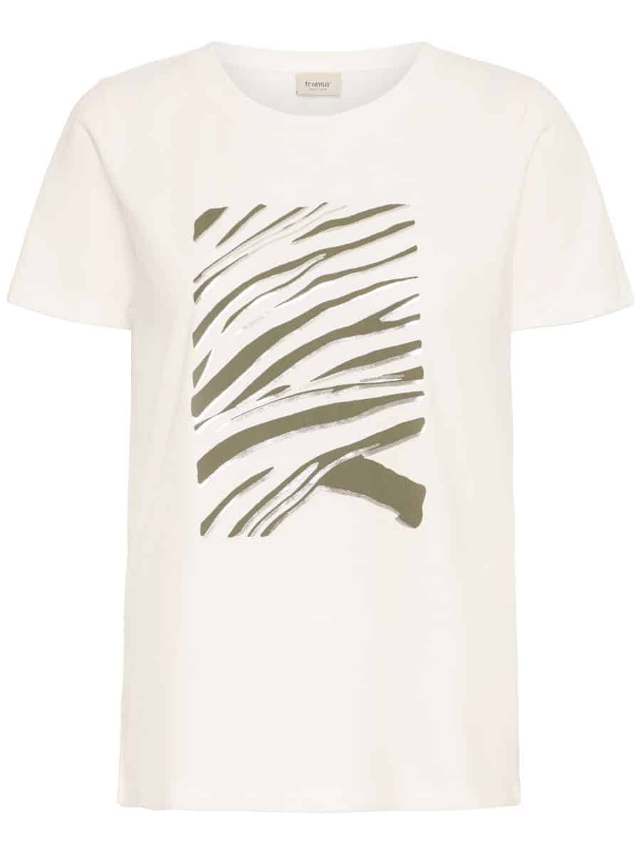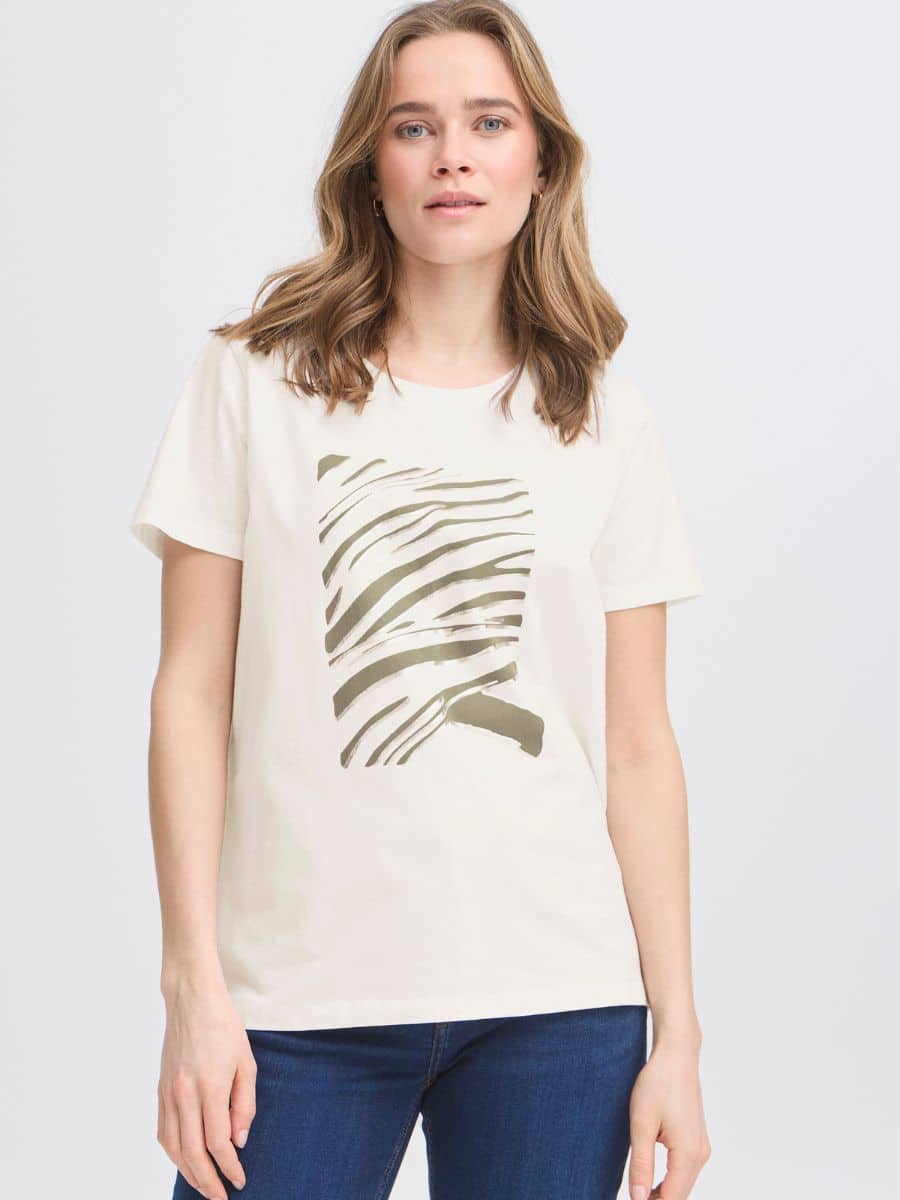 Denne smukke model er med en klassisk rund halsudskæring, og med korte ærmer, derudover har T-shirten en klassisk pasform, som er en dejlig detalje. Denne lækre Fransa T-shirt har et lækkert zebra print i grøn og sølv foran på brystet.