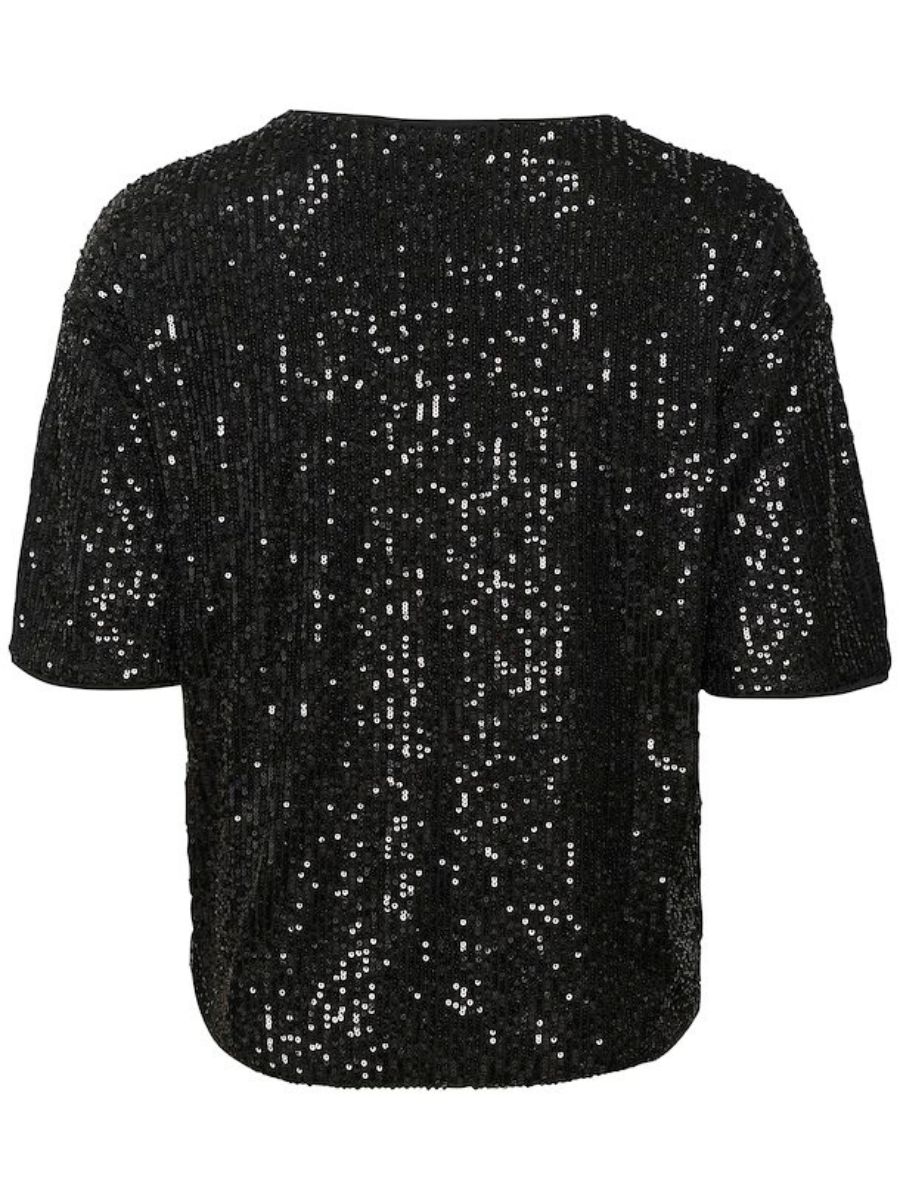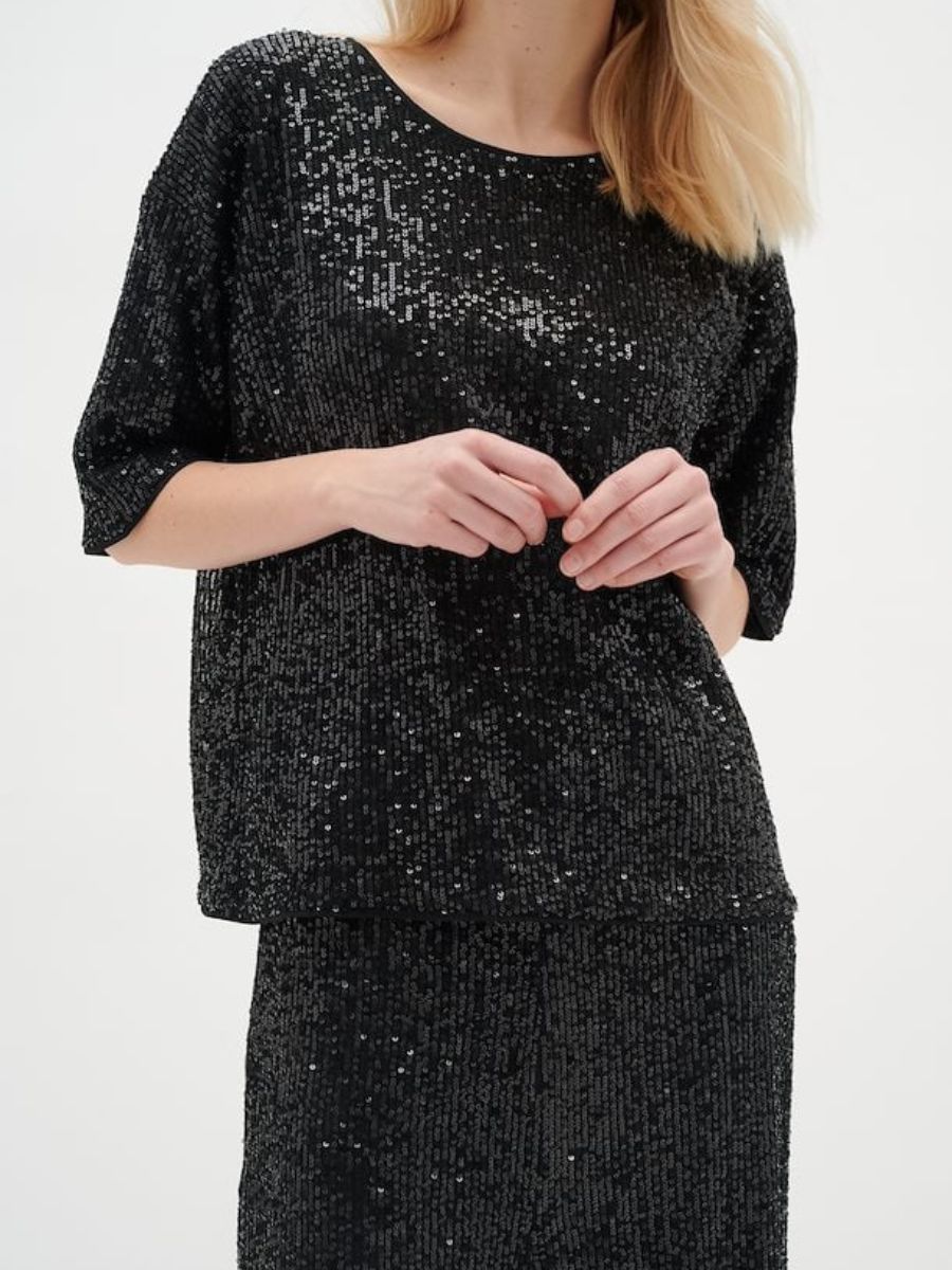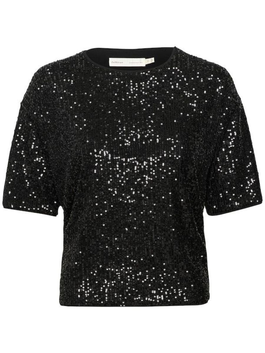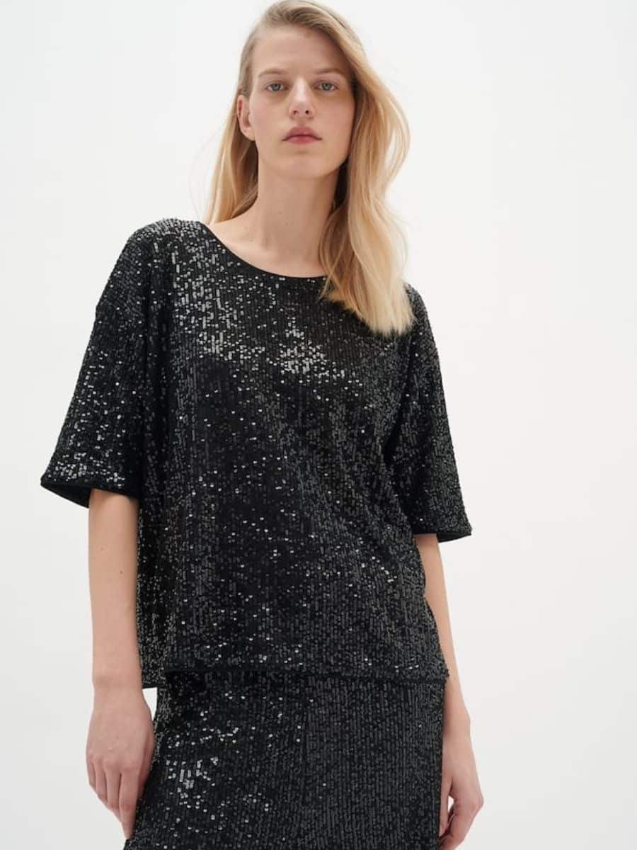 Inwear T-shirt JARJARIW – Black ♥ Denne Inwear bluse er i den klassiske sorte farve, med de fineste sorte pailletter, hvilket giver t-shirten den fineste detalje. Denne model er i et lidt baggy fit, hvilket gør blusen sidder lidt oversize, eller er denne bluse med en fin hals udskæring, lidt store 1/2 lange ærmer, samt er denne bluse fyldt med alle de fineste detaljer, som giver denne bluse et lækkert og feminint look. Denne T-shirt kan enten bæres ved fine lejligheder, eller måske en tur i byen.