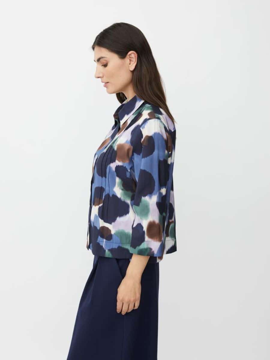 Denne smukke model er med en smart reverskrave, som går ned i en gennemgående knappe lukning, derudover har denne smukke Masai bluse et kort boxy snit, med smukke syninger foran, og en kort slids i begge sider i bunden. Blusen har 4/5 lange ærmer, som er en smuk detalje, ærmerne sidder løst til kroppen, som giver en smart og moderne detalje.