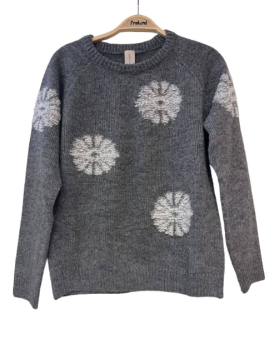Skovhuus Strik 3900 – Grå ♥ Denne smukke Skovhuus strik er i en smuk grå farve, og har et lækkert hvidt blomster mønster, som er en smart detalje. Strikken er lavet i lækre materialer, som gør den super behagelig at have på.