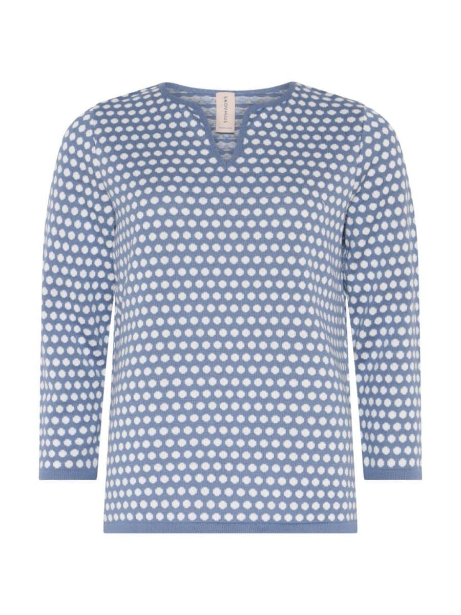 Skovhuus Strik 4282 – Peal Blue ♥ Denne smukke Skovhuus strik er i den smukkeste lyseblå farve, med lækre hvide polka prikker, derudover er strikken fyldt med en masse lækre detaljer. Denne smukke strik er lavet i lækre materialer, hvilket gør den super komfortabel at have på.