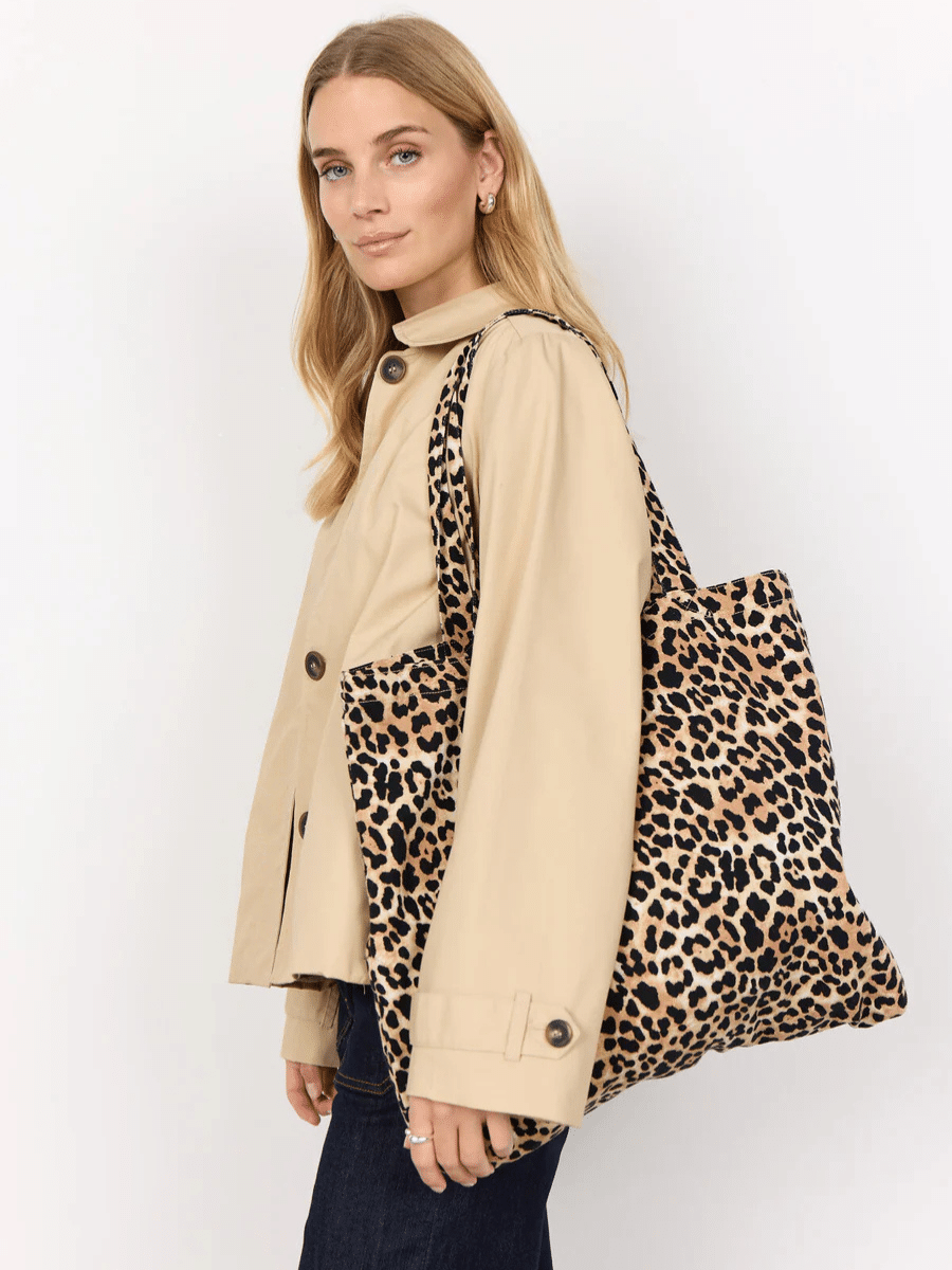 - Design: Leopardprint i sandfarve, hvilket gør tasken både trendy og klassisk.