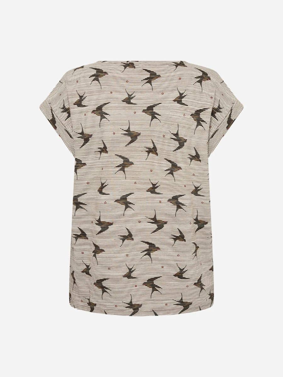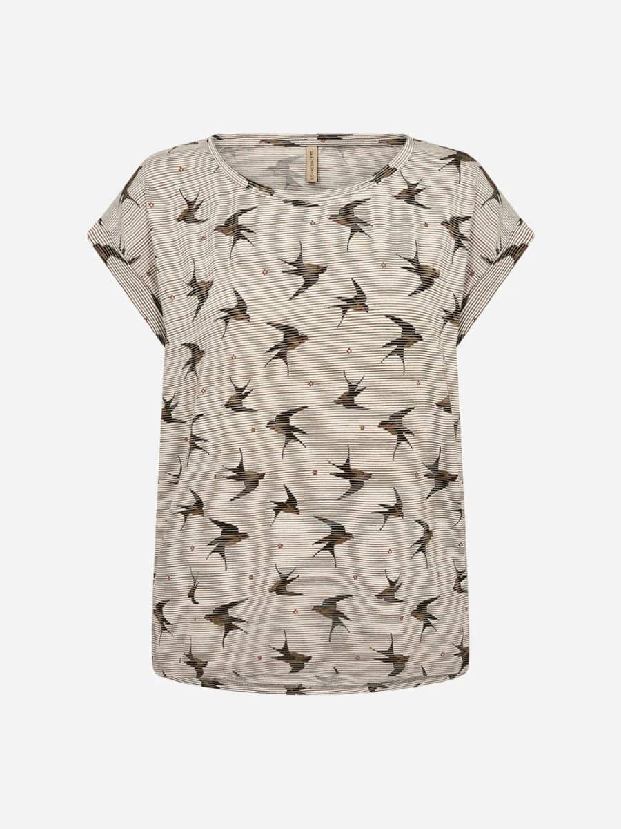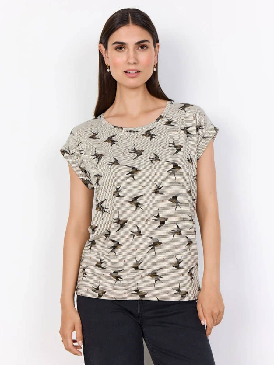 Soyaconcept T-Shirt Galina – Grøn ♥ Denne lækre T-shirt fra Soyaconcept er lavet i en masse lækre materialer, som gør den supoer behagelig at have på, T-shirten er i det lækreste stribet print, med små fugle på, i en masse grønne nuancer.