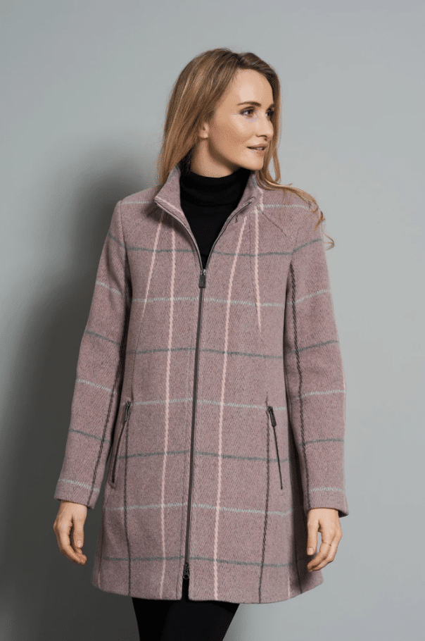 Smart Klassisk uld Jakke fra Junge. Modellen er med gennemgående lynlås og med en lidt høj krave , hvor lynlåsen kan lynes helt op til halsen. Ærmerne er lange og i hver side er der skrå lynlås lommer samt er jakken i en flot rosalyng farve og med en svagelig tern. Junge Uld jakker er fantastik varme og har en høj kvalitet i deres uld. Brug denne Junge Uld jakke med et lækkert tørklæde for et smart out fit