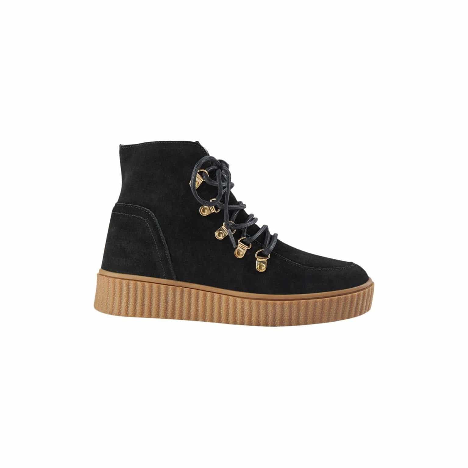 Smart Sofie Schnoor Vinterstøvle. Modellen er med gummi sål og med guld små spænder. En klassisk og smart Sofie Schnoor støvle i sort ensfarvet ruskind. En Smart Støvle som du kan style til kjoler eller til jeans..