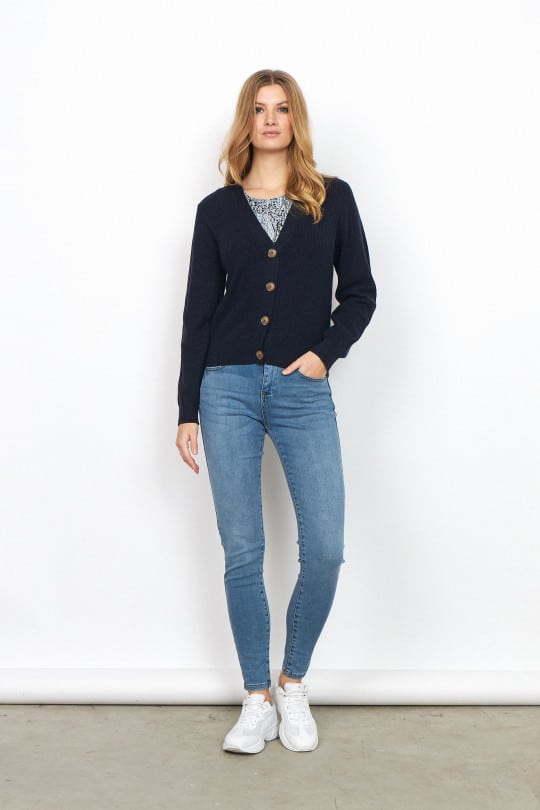Super blød og smuk strikket cardigan fra soyaconcept, i en smuk navy farve. Soyaconcept cardiganen har en v-hals udskærring, og lukkes med fire knapper. Soyaconcept cardiganen er perfekt til at slynge over en t-shirt for holde varmen, og opnå et stillet look.