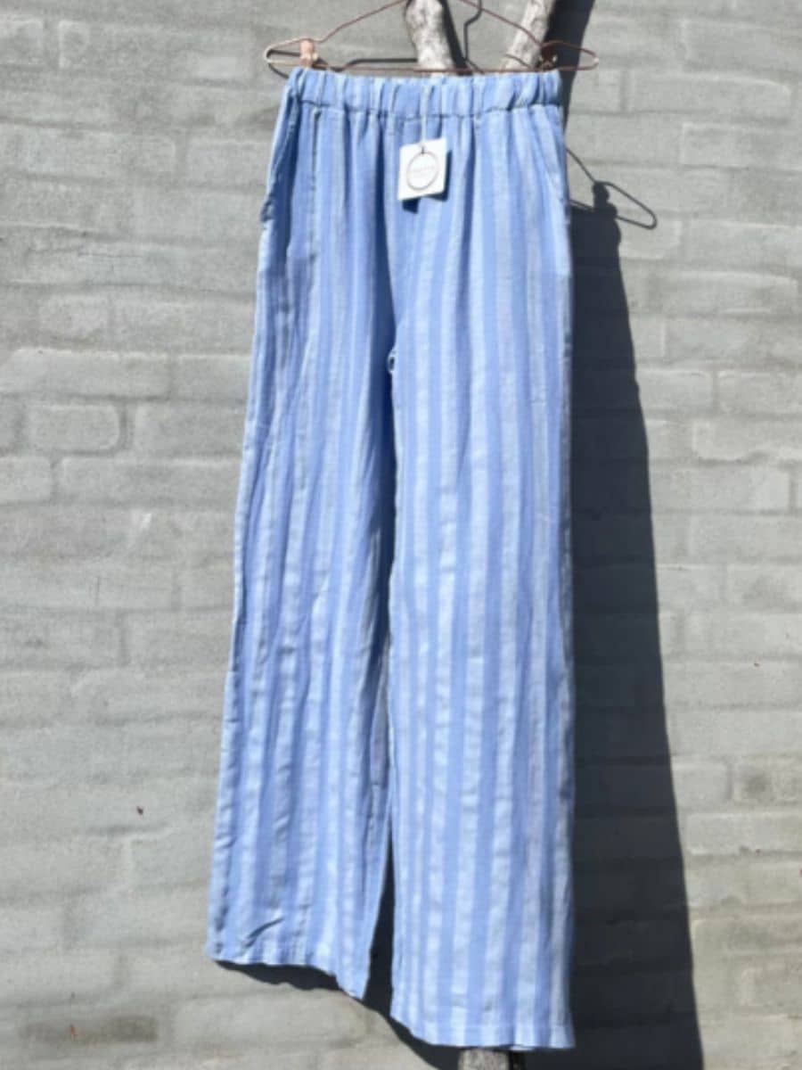 Cabana living buks Papliva – Sky Stripe ♥ Disse smarte bukser fra Cabana Living er i et smart stribet print, i to forskellige blå nuancer. Modellen er med elastik i taljen, som er en lækker detalje, samt har bukserne stiklommer foran, som er en praktisk, og smart detalje, derudover sidder bukserne løst til kroppen, og er super luftige at have på. Disse smarte bukser kan styles med en smart hvid T-shirt, og med et par sandaler, for at holde det klassisk.