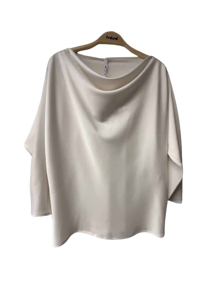 Imperial bluse cla6 – Champagne ♥ Denne smukke bluse fra Imperial er i en smart Off-White farve, i et skinnende materiale. Modellen er med en smuk bådudskæring, og vandfaldseffekt i halsen, som er en smuk detalje, og giver en smuk drapering foran, samt har denne bluse 3/4 ærmer, som sidder tæt til kroppen, som er en lækker detalje. Denne smukke Imperial bluse kan styles på mange smukke måder, om det er på kontoret, eller til en festlig lejlighed, du kan evt. style blusen med en sort lang nederdel, og med et par fine læder støvler.