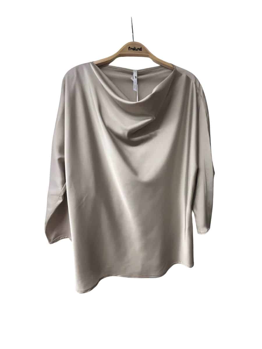 Imperial bluse cla6 – Mastice ♥ Denne smukke bluse fra Imperial er i en smuk sand farve, i et skindene materiale. Modellen er med en smuk bådudskæring, og vandfaldseffekt i halsen, som er en smuk detalje, og giver en smuk drapering foran, samt har denne bluse 3/4 ærmer, som sidder tæt til kroppen, som er en lækker detalje. Denne smukke Imperial bluse kan styles med et par smarte habitbukser, og med et par sorte støvler.