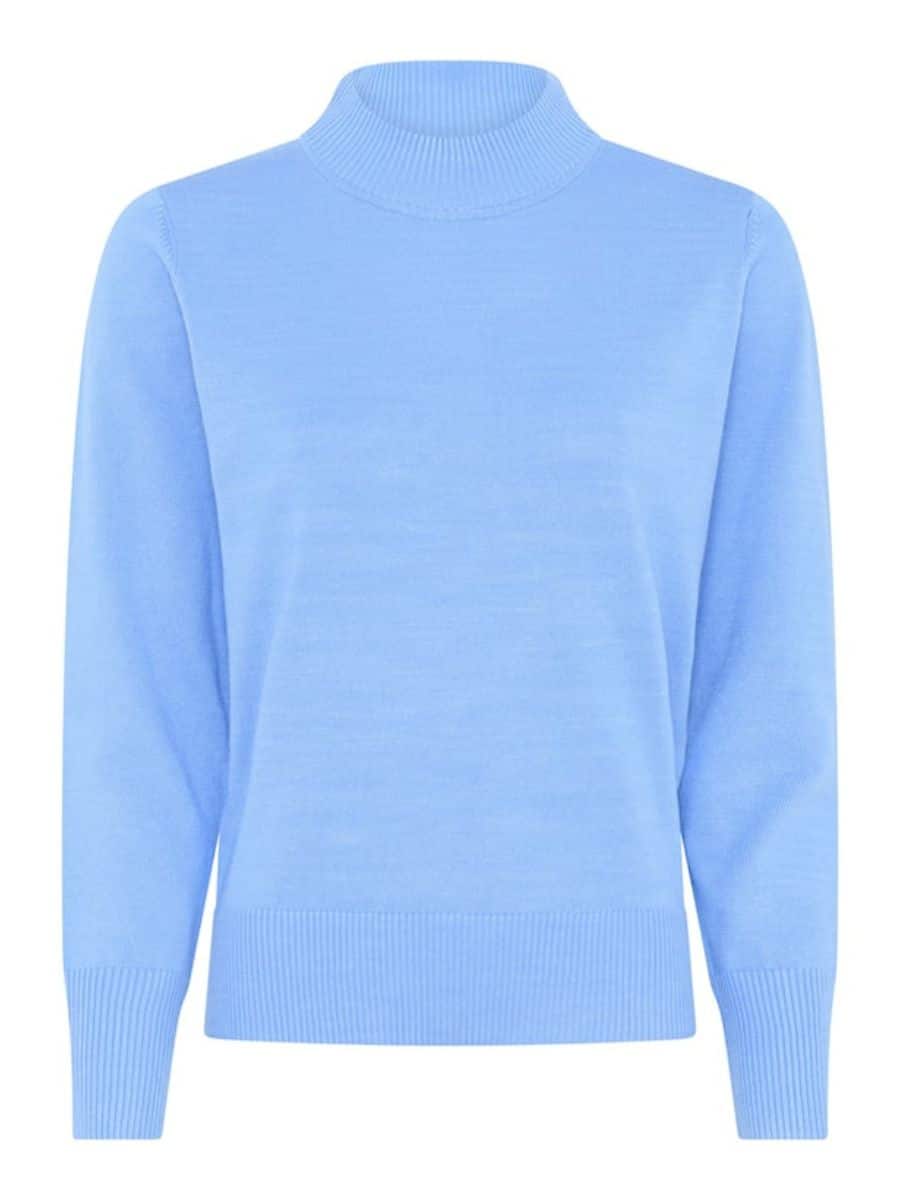 Micha Strik 150135 – Blå ♥ Denne smukke Micha strik er i den smukkeste lyseblå farve, og er lavet i lækre materialer, som gør den super komfortabel at have på. Denne strik er fyldt med en masse smukke og feminine detaljer.