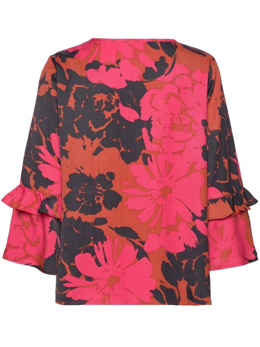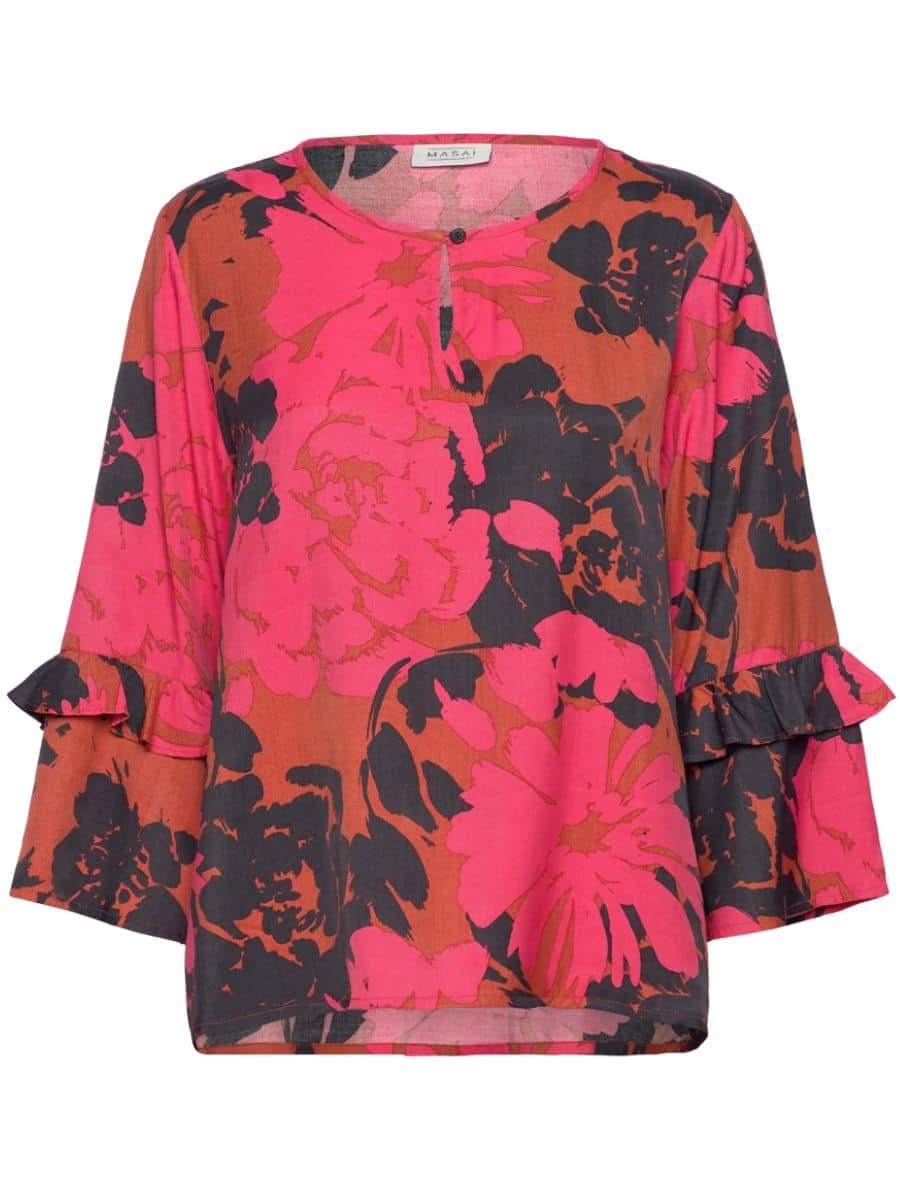 Masai Bluse Mabimelda – Picante ♥ Denne Masai bluse er i det smukkeste pinke/røde blomster print, hvilket giver blusen det fineste præg af noget feminint. Denne model er med en rundhals udskæring, med lange ærmer, som er store i bunden og med flæse detaljer. Ellers er denne model med en fin lille knap i hals udskæringen, som gør det muligt at halsudskæringen kan stå åben. Denne model er perfekt til et par jeans, for at opnå et lækkert look.