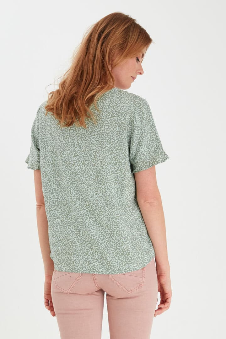 Fransa t-shirt i en lysegrøn og mørkegrøn farve. Fransa t-shirten er med en V-udskæring, og har korte ærmer med nogle frønser. Fransa t-shirten er i et super blødt og lækkert materiale, som sidder super godt på kroppen. Styl denne fransa t-shirt til et par jeans, eller en nederdel, og få et smukt look!