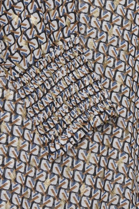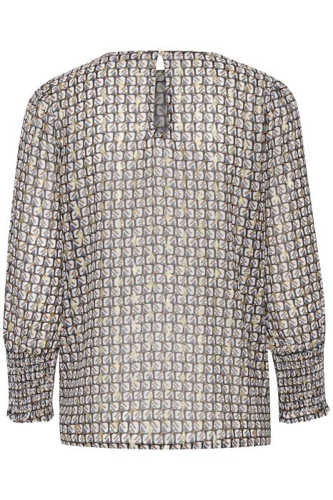 Smuk og feminin bluse fra Fransa, i et fedt grafisk print, med sort, hvid, blå og brune farver, samt fine guld-detaljer. Modellen er med en fin rund halsudskæring, med slis og knaplukning i nakken, samt blusen har smock ved håndleddene. Lækker bluse, som du nemt kan style til diverse underdele, for et stilfuldt og feminint look.