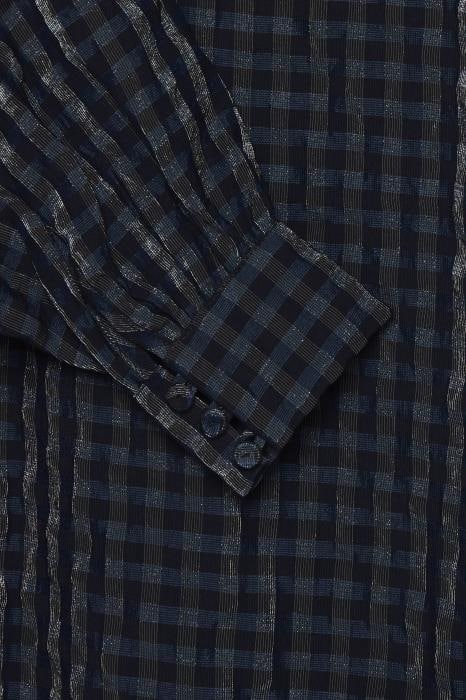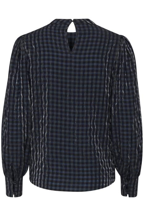 Smart bluse fra Fransa, med terne, af sort, mørkeblå og sølv. Modellen er med en tætsiddende halsudskæring, med slis og knaplukning i nakken, ærmerne er med balloneffekt, samt tætsiddende ved håndleddene med slis og knaplukning. Styles let til bukser og en let støvle for et smart og feminint look.