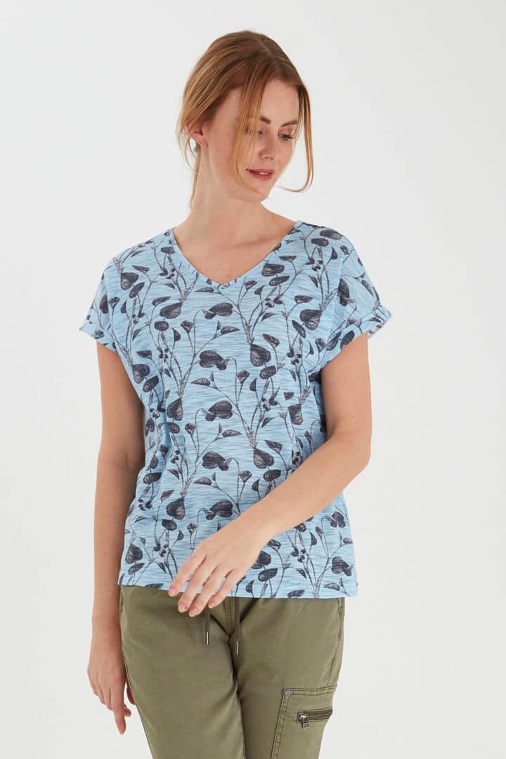 Lyseblå printet Fransa T – Shirt med V halsudskæring samt med korte vinge ærmer som har et lille ombuk. Denne Fransa T – Shirt er med et smart print af blomster. Kvaliteten er let og i en blandings kvalitet af Polyester/Bomuld. Styl denne smarte Fransa T-Shirt til jeans – Shorts – over dine nederdele for et lækkert look. Fransa er kendt for deres super kvaliteter som ikke forandrer sig i vask.