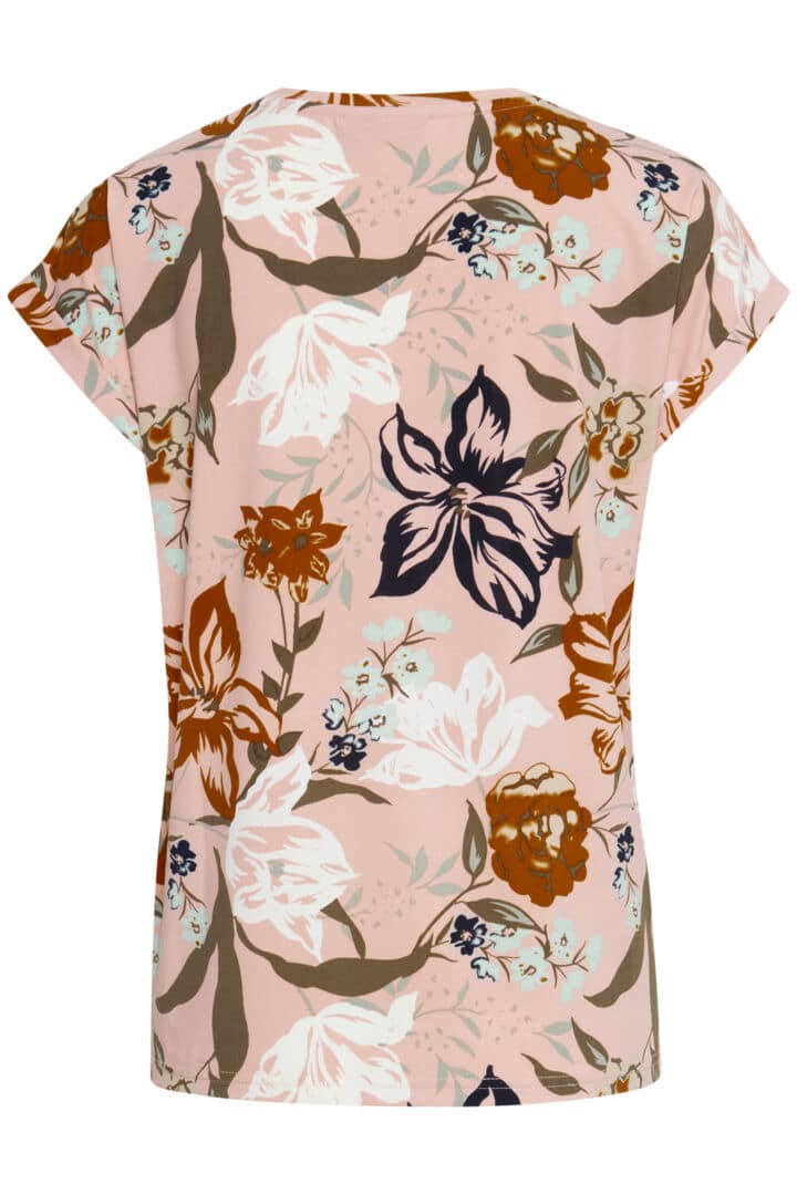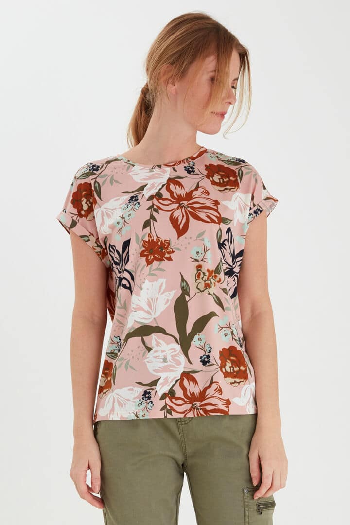 Fransa T- Shirt I rosa Med grafisk print at blomster. Modellen er med rundhals og med kort ombukkede ærmer samt er denne Fransa T – Shirt i en Lækker blød og let kvalitet. Style denne T- Shirt til jeans eller styl den over en smart nederdel. Farverne gør at den kan bruges til mange forskellige underdele. En Fransa T – Shirt er et Must Have i din garderobe. Denne style kan vaskes mange gange og forandre sig ikke