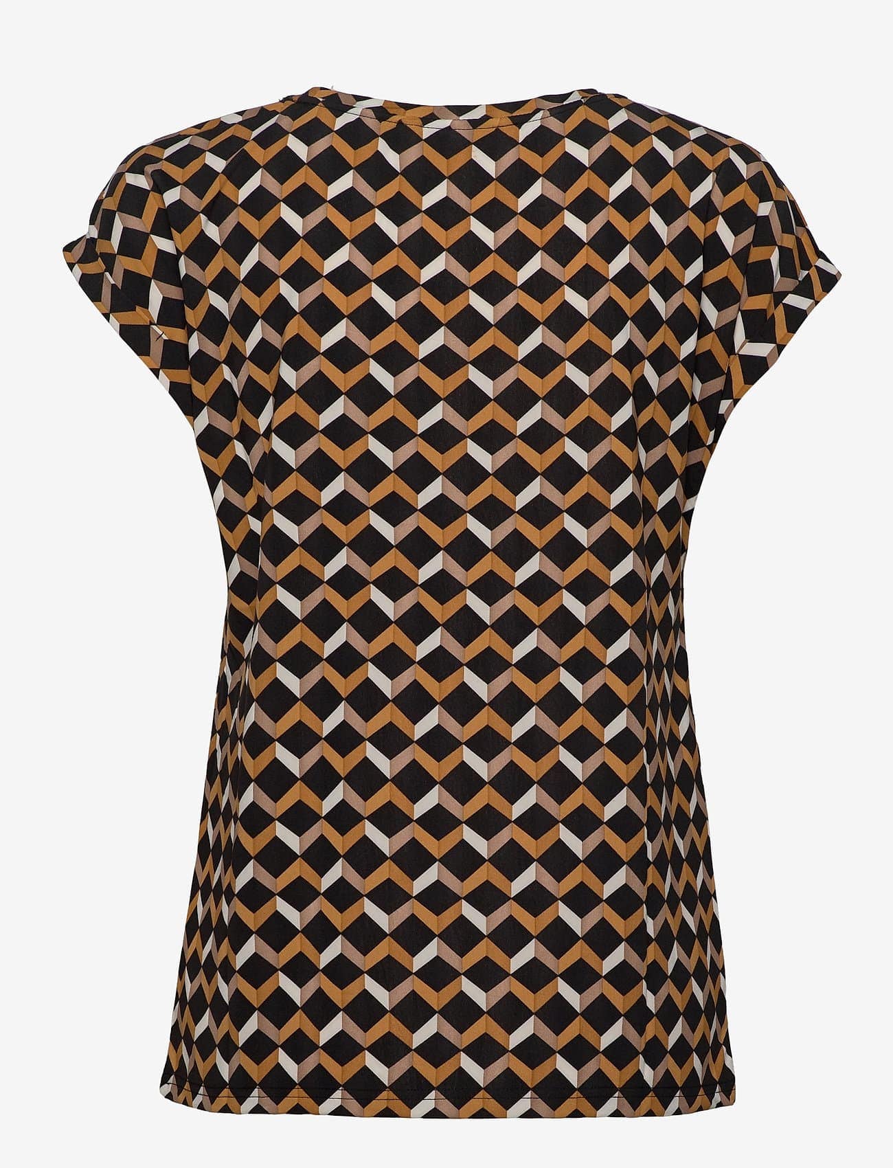 Smart t-shirt fra Fransa, i sort, med et fedt mønster i forskellige nuancer af brun, hvid og en mørk gullig farve. En smuk kortærmet t-shirt, med en rund halsudskæring og et lille ombuk på ærmerne som en fin detalje. T-shirten er i en lækker kvalitet med massere af stræk. Styles let til forskellige underdele, med en let jakke eller cardigan over for et smart look.