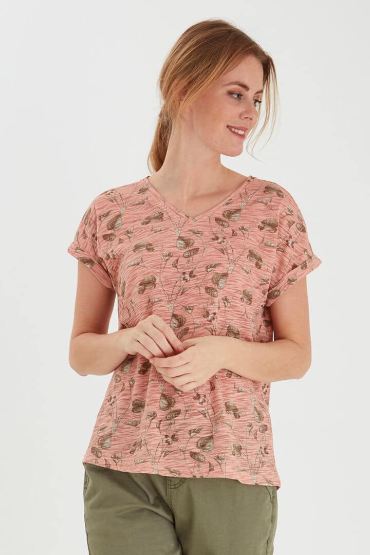 Flot rosa farvet printet Fransa T – Shirt med V halsudskæring samt med korte vinge ærmer som har et lille ombuk. Denne Fransa T – Shirt er med et smart print af blomster. Kvaliteten er let og i en blandings kvalitet af Polyester/Bomuld. Styl denne smarte Fransa T-Shirt til jeans – Shorts – over dine nederdele for et lækkert look. Fransa er kendt for deres super kvaliteter som ikke forandrer sig i vask