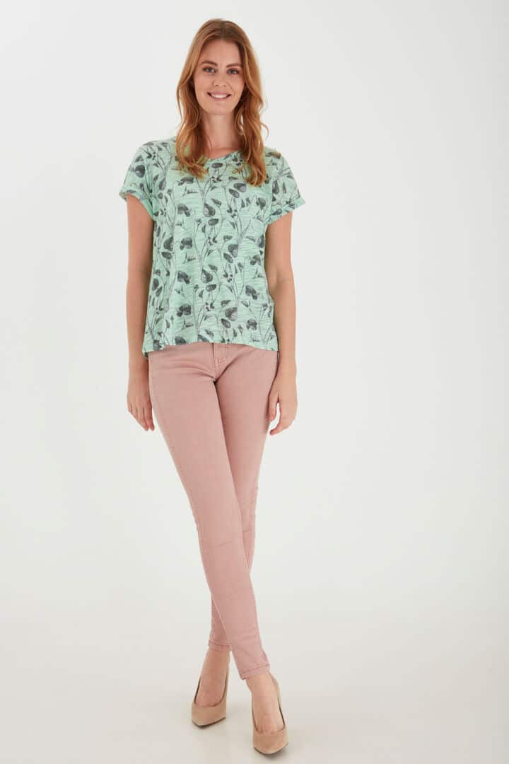 Smart Lysegrøn Fransa T – Shirt med V halsudskæring samt med korte vinge ærmer som har et lille ombuk. Denne Fransa T – Shirt er med et smart print af blomster. Kvaliteten er let og i en blandings kvalitet af Polyester/Bomuld. Styl denne smarte Fransa T-Shirt til jeans – Shorts – over dine nederdele for et lækkert look. Fransa er kendt for deres super kvaliteter som ikke forandrer sig i vask
