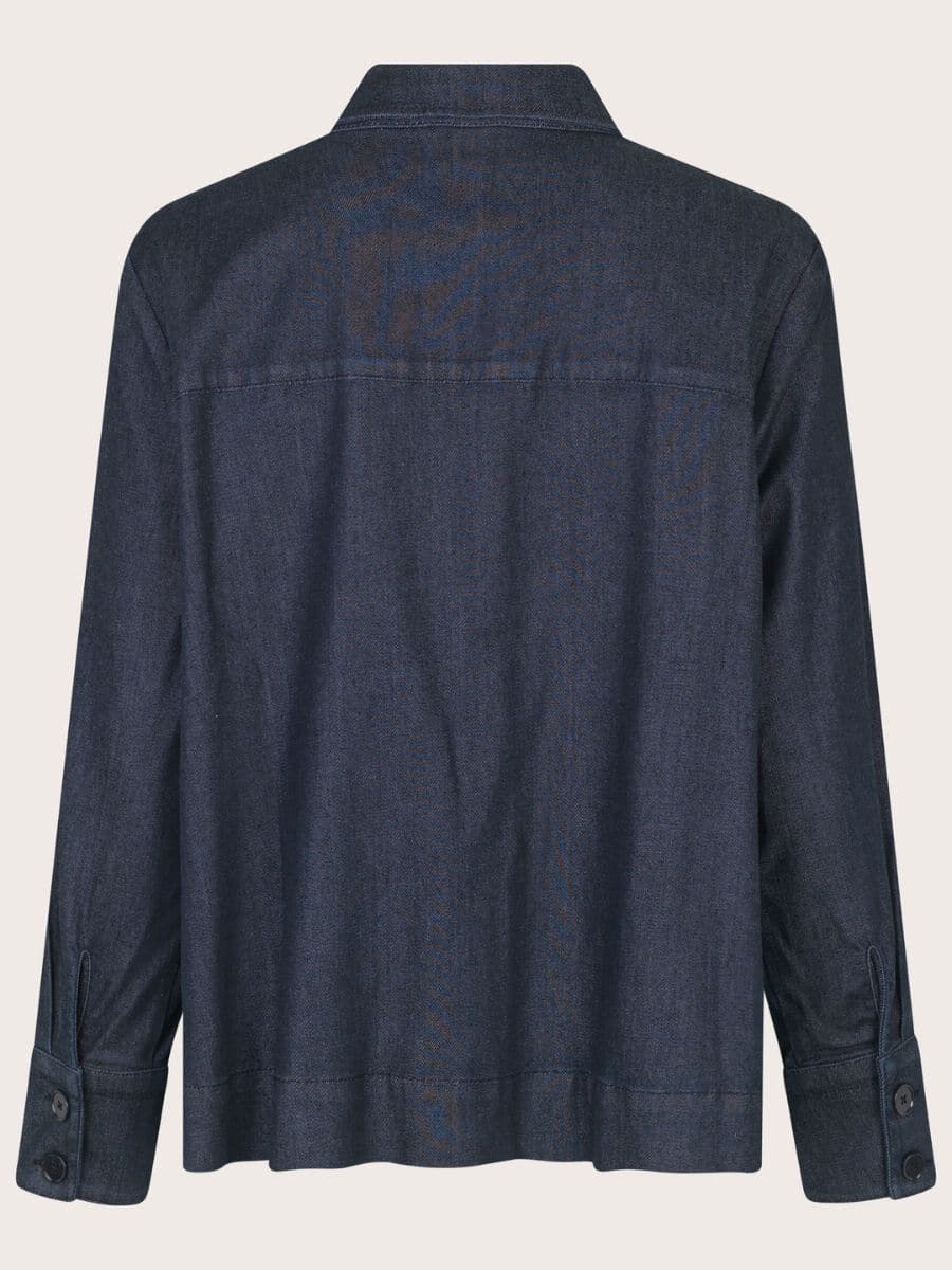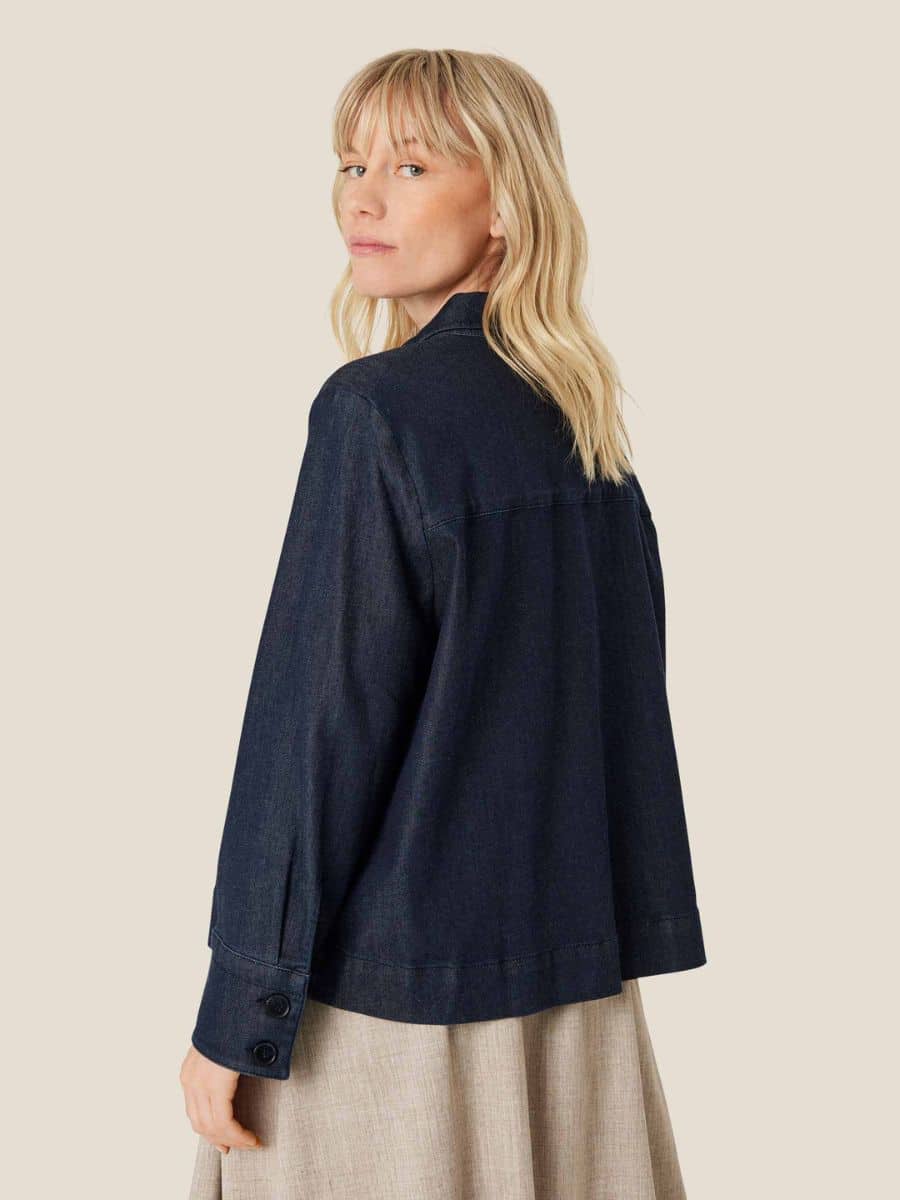 Den mørkeblå denimfarve giver et tidløst og elegant udtryk, der er let at style med forskellige outfits. Den dybe farve tilføjer en sofistikeret kant og kan nemt kombineres med både lyse og mørke farver, hvilket gør jakken ideel til både formelle og afslappede anledninger.