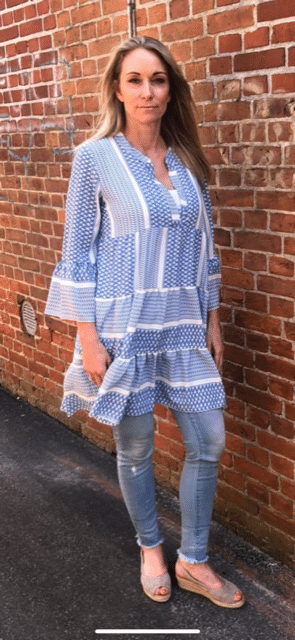 Smart Tunika Kjole fra Bæltekompagniet. Modellen er med åbentstående halsudskæring og med 3/4 lange ærmer med flagermus ærmer og kjolen er med vidde i 2 lag. Den er i en lækker kvalitet og føles blød, let og lækker, perfekt til sommeren. Styl denne kjole med jeans under brug den med bare ben til et par smarte sandaler.