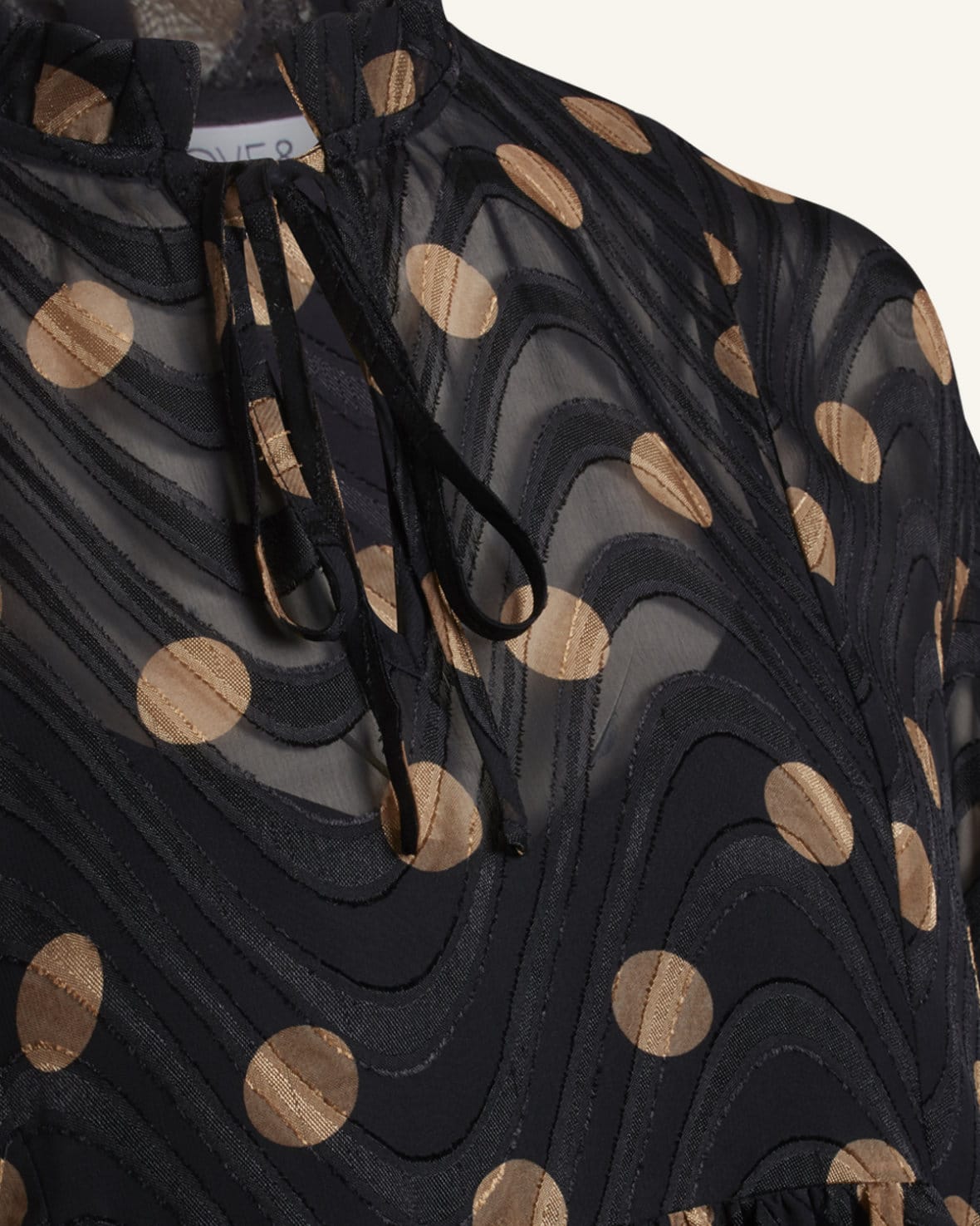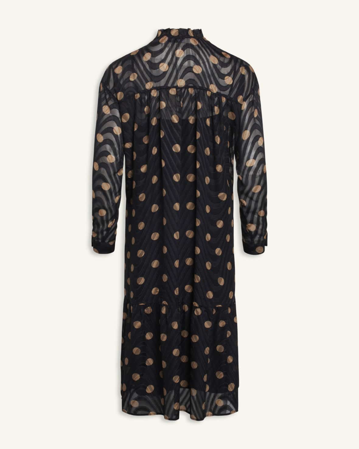 Fineste kjole fra Love & Divine, i sort med et flot struktureret print og smukke guld prikker på. Modellen er med en lille krave, samt med åbentstående halsudskæring og snørreeffekt ved halsen. Der medfølger en aftagelig underkjole, som sættes fast inde i kjolen. Kjolen er nem at style både op og ned, og du kan nemt bruge den til hverdag såvel som festlige begivenheder
