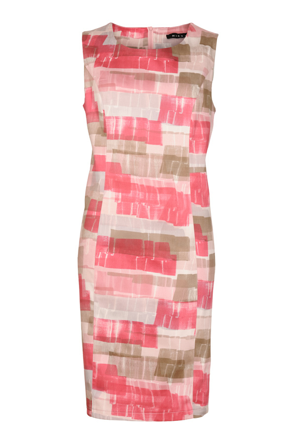 Sød kjole fra Micha i lyserøde nuancer med en klassisk pasform. Modellen er med rund hals, lynlås i ryggen og uden ærmer.