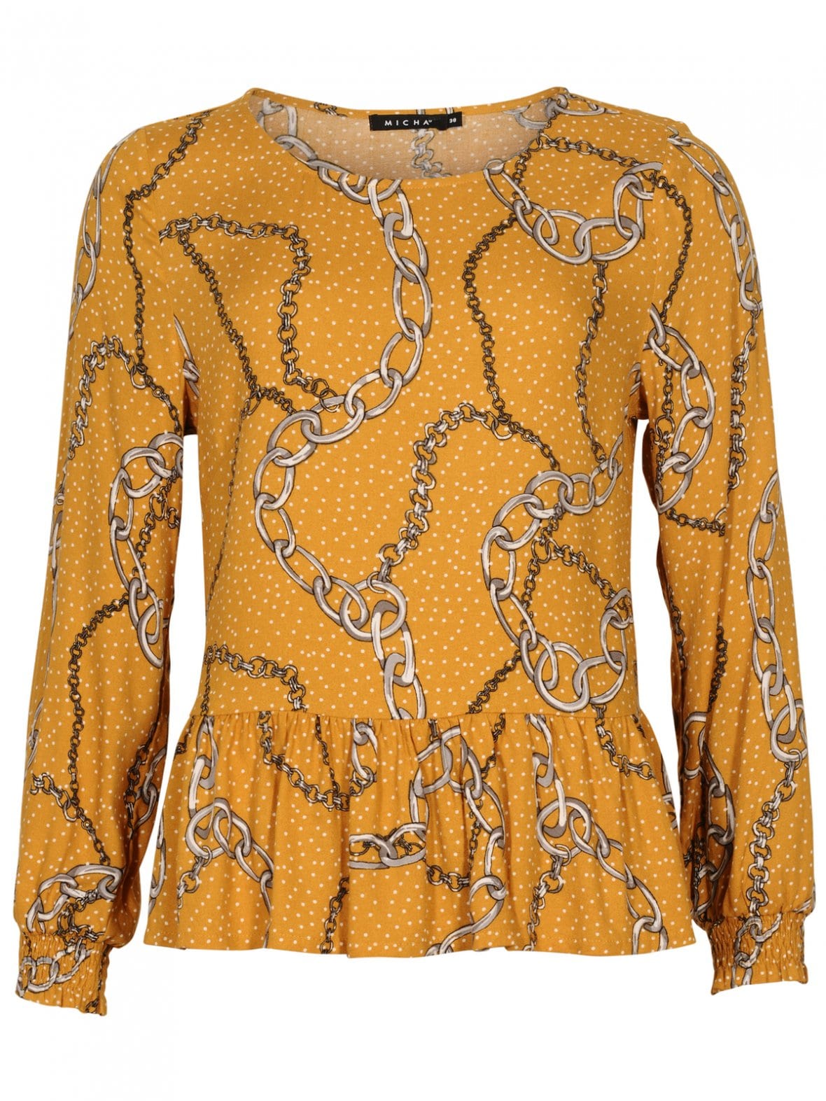 Fin bluse fra Micha. Blusen er med rund krave, lange ærmer med elastik i enden, i enden af blusen er der flæs.