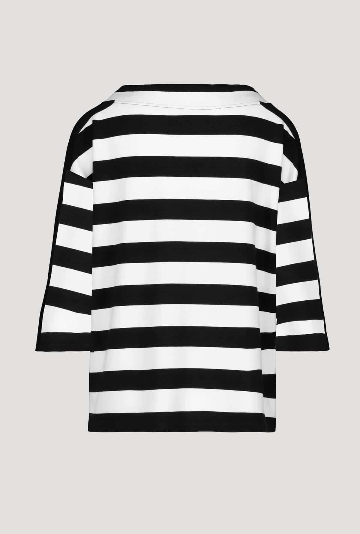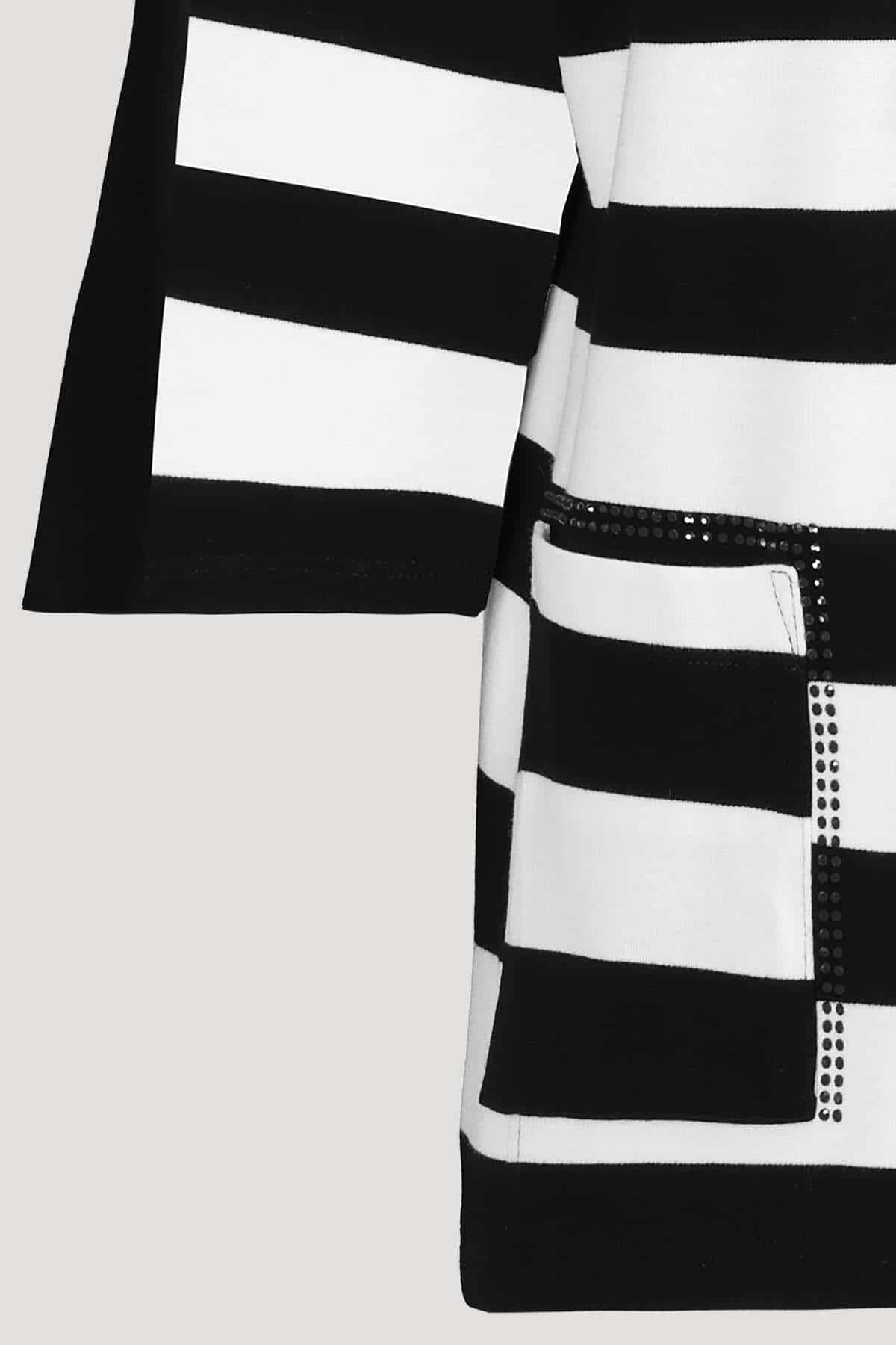 T-shirt fra monari i en stribet sort og hvid farve, samt er t-shirten med 3/4 lange ærmer. Modellen er med en rund-hals udskæring som kan gøres mindre med et snørrebånd, samt er der en lomme på højre side af t-shirten som er med en masse søde detaljer. Styl denne t-shirt til et par jeans og støvler og få et stillet look.