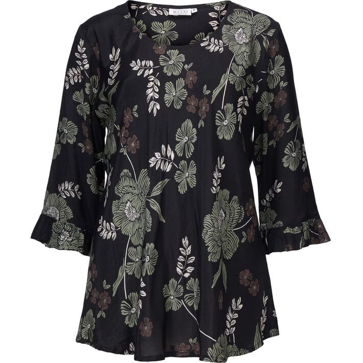 Flot bluse fra Masai i sort med grønne blomster print. Modellen er med rundhals og med 3/4 lange ærmer med flæse kant. Styl denne bluse over nederdel eller over jeans for et lækkert look