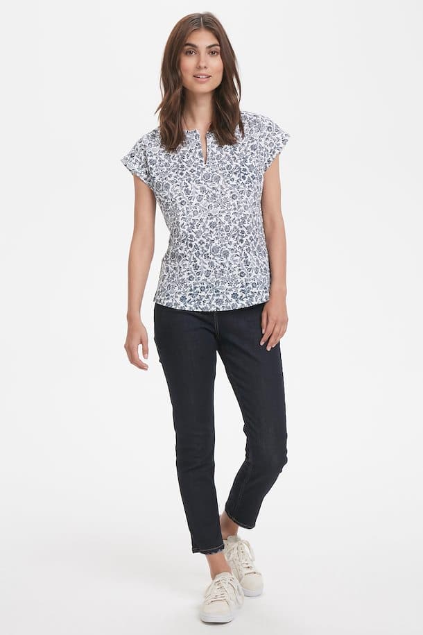 Lækker bomulds T – Shirt fra Part Two i et flot navy mønster. Modellen er med åbentstående halsudskæring samt med korte ombukkede ærmer. Styl denne smarte T – Shirt til jeans eller shorts for et sommer look
