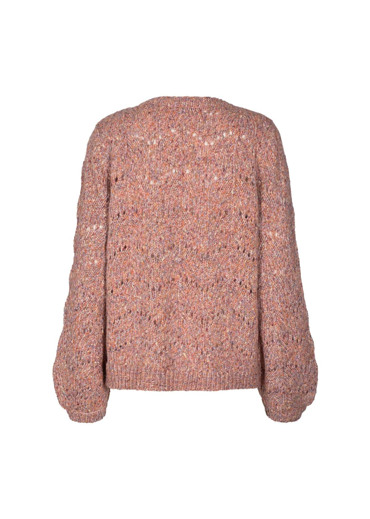 Smuk grov strik fra Soyaconcept, i meleret rosa, med diskrete nuancer af pastelfarver. Modellen er med en v-halsudskæring og lange pufærmer en bred ribkant ved håndleddene. Denne smukke og varme strik pullover kan let styles over diverse outfits, både bukser, nederdele og kjoler, for et smukt og feminint look. Strikken findes også i en smuk brun farve.