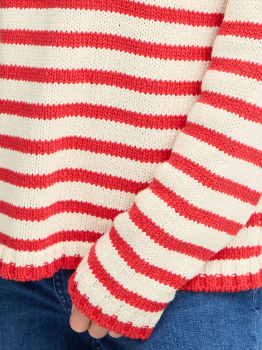 Denne elegante strik fra Fransa forener komfort og stil i et flot design. De røde og beige striber giver strikken et friskt og moderne udtryk, mens de fine guldfarvede detaljer på skuldrene tilfører et strejf af eksklusivitet og elegance.