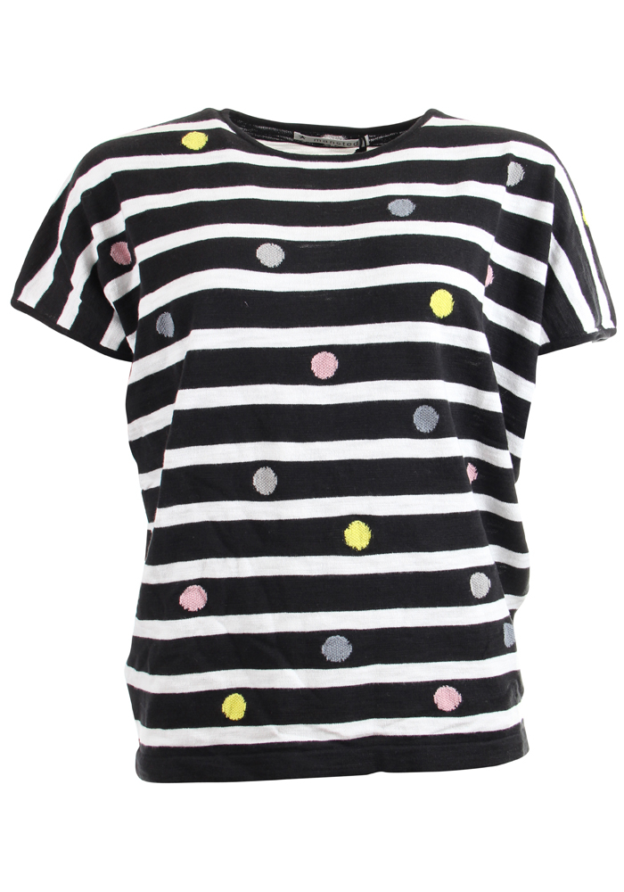 Super sød strikbluse fra Mansted i en blød og behagelig oversize pasform. Modellen er med rund halsudskæring, korte ærmer og stribet med prikker i gule, grå og lyserøde nuancer. Styles med er par smalle jeans for et elegant look.
