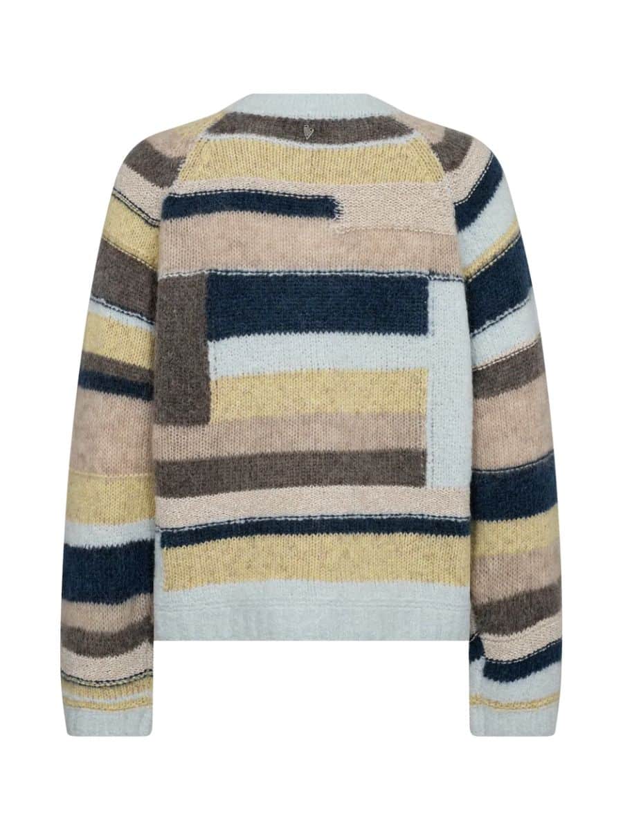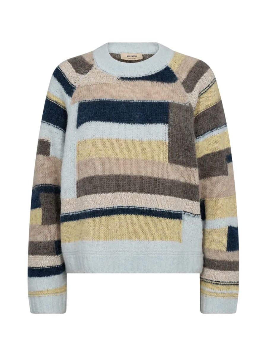 Tilføj et strejf af charme og personlighed til din garderobe med denne smukke patchwork-strik fra Mos Mosh. Strikken er designet i de fineste lyse farver og har en regulær pasform, der sikrer en behagelig og flatterende silhuet. De ensfarvede ribkanter ved halsudskæringen, forneden og ved manchetterne skaber et stilrent modspil til det farverige og teksturerede patchwork-design.