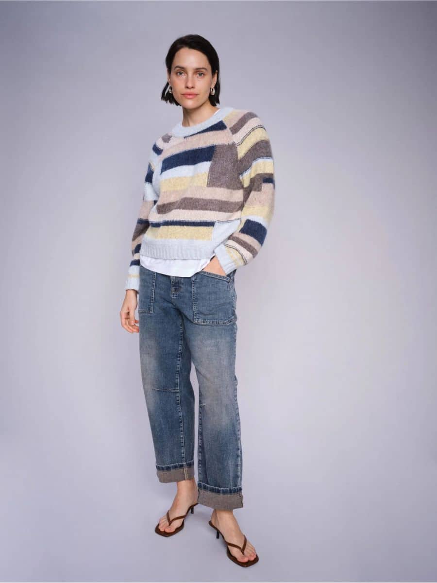 Det unikke patchwork er håndlavet og sammensat af forskellige farver og strukturer, hvilket giver strikken en autentisk og eksklusiv fornemmelse. Farvekombinationen i de lyse toner gør den nem at style og ideel til foråret og sommeren, når du vil skabe et afslappet, men sofistikeret look.