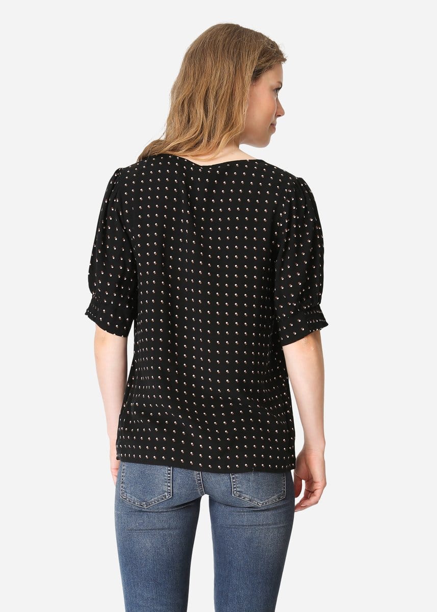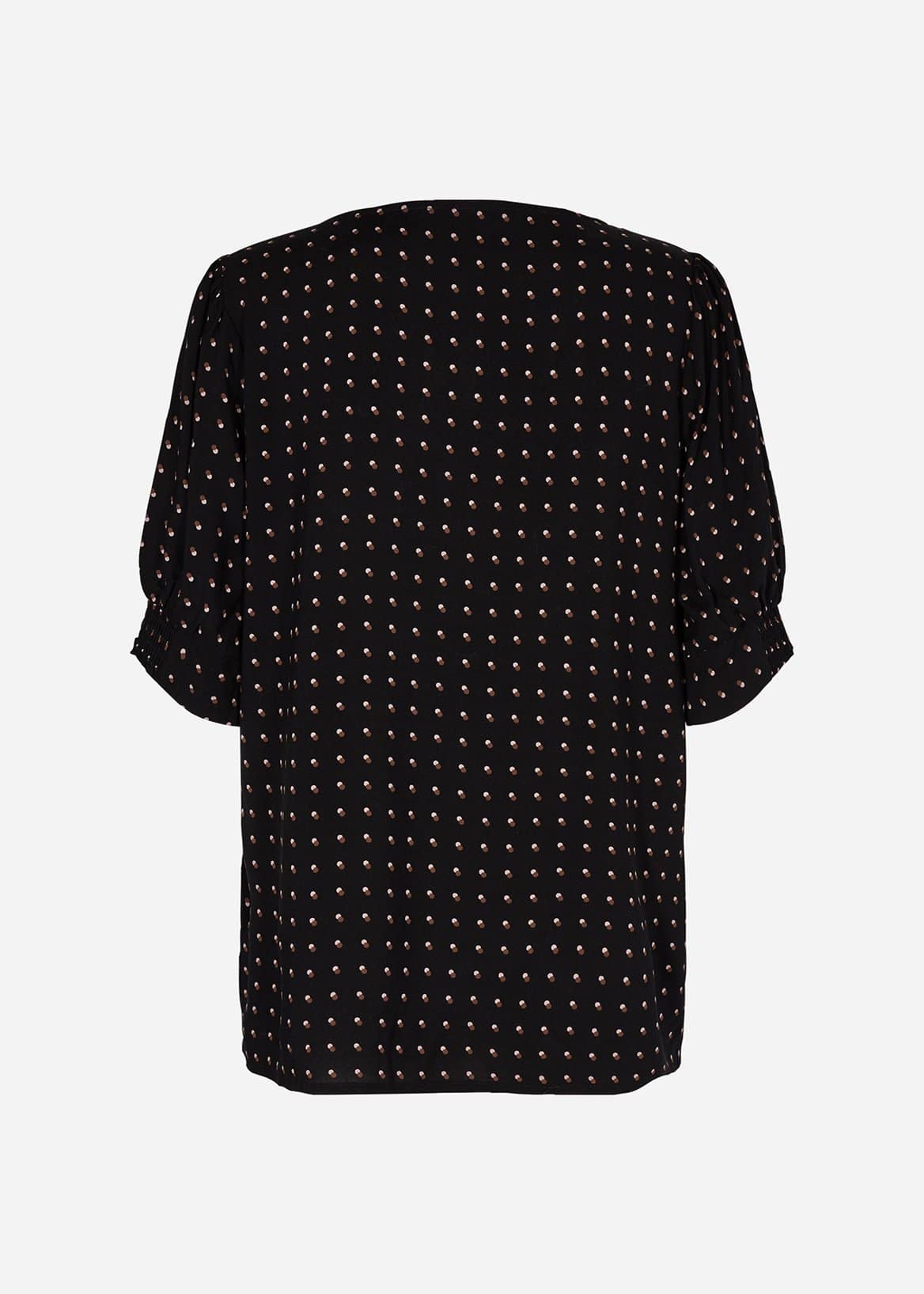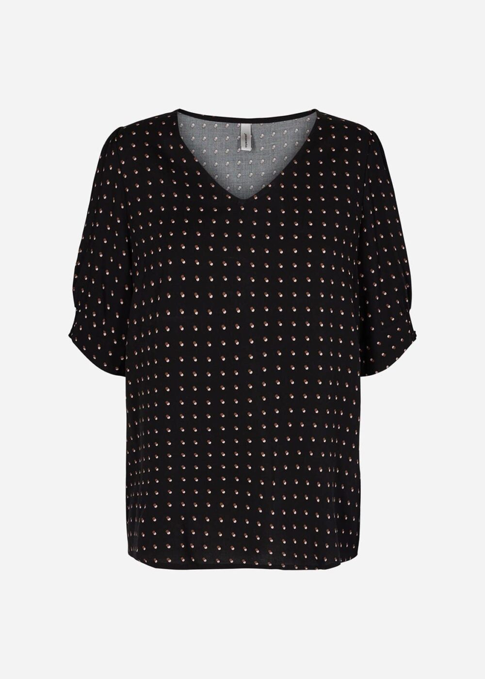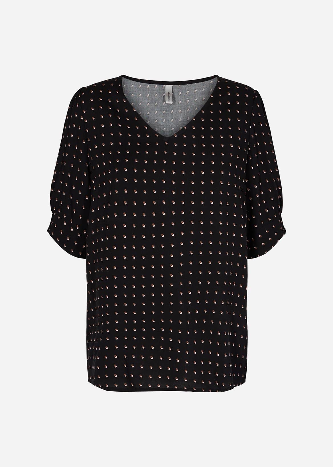 Flot bluse fra Soyaconcept. Blusen er i sort med brune og rosa prikker, en v-halsudskæring, T-Shirt ærmer med elastik for enden. Super flot sammen med et par jeans.