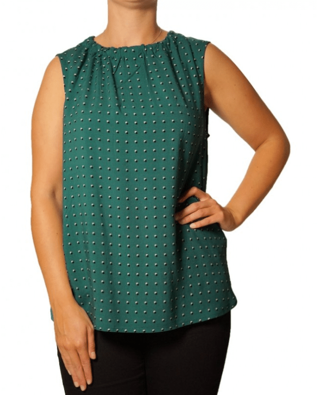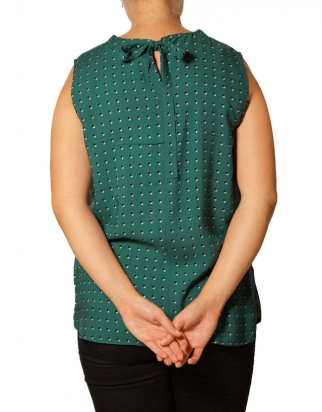 Flot top fra Soyaconcept. Toppen er i en fed grøn farve, med små sorte og hvide prikker på, en flot krave, som kan bindes i nakken. Sæt den sammen med et par jeans, eller nederdel