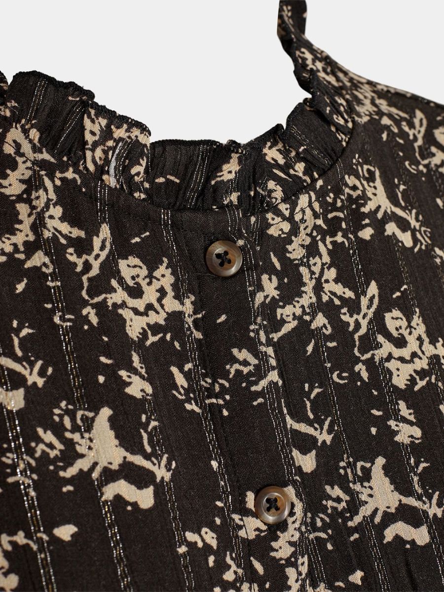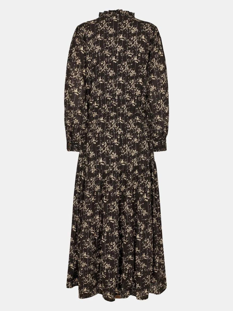 Sophie Schnoor Kjole – Brun ♥ Smuk efterårskjole fra Sofie Schnoor i de flotte brunlige nuancer, med guld tråd i. Kjolen er lang, og med lange ærmer, og med en rund halsudskæring med lidt flæs. Kjolen har knaplukning fra taljen og op til halsen, samt et elastikbånd rundt i taljen.