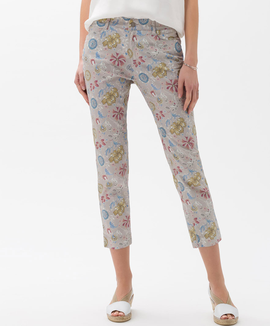 Smarte Blomstret bukser fra Brax. Modellen er med fast linning samt med bælte stropper og med side lommer i hver side bagpå har buksen 2 baglommer og i fodvidden er der små slidser. Styl denne blomstret Brax buks sammen med en flot og feminin bluse eller skjorte for at få et lækker sommer look